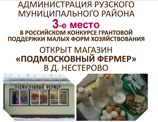 В текущем году администрация Рузского муниципального района приняла участие в Российском конкурсе грантовой поддержки малых форм хозяйствовании. По итогам которого заняла 3-е место, награждена бронзовой медалью и дипломом.