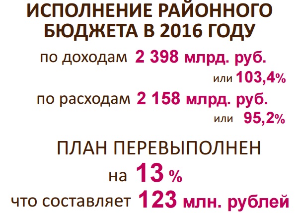 В целом исполнение районного бюджета в 2016 году составило по доходам – 2,398 млрд. руб. или 103,4 % (в 2015 г. – 1,949 млрд. руб. 95 %); по расходам – 2,158 млрд. руб. или 95,2 % (в 2015 г. – 1,957 млрд. руб. или 93,5 %).