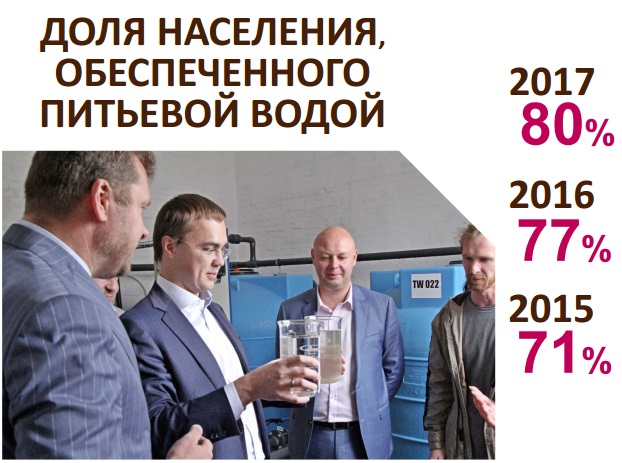 Обеспеченность населения доброкачественной водой в 2017 году составит 80 %.