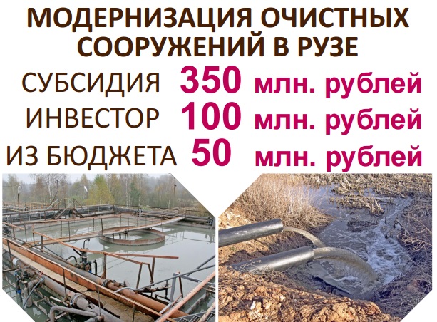 В 2016 году всего 4 города в России, включая Рузу, вошли в федеральную программу модернизации очистных сооружений. Очистные в Рузе, построенные в 1976 году, получили из федерального и областного бюджета субсидию в размере 350 млн. руб., еще 100 млн. руб. предоставил инвестор. Наш бюджет потратит на эту программу всего 50 млн. руб.