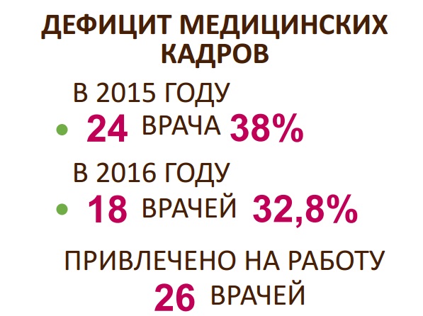 В 2015 году дефицит самых необходимых специальностей врачей составил 24 в первичном звене или 38%, в 2016 году дефицит первичного звена составил 18 врачей - 32,8% (в 2016 году принято 39 врачей, уволилось - 13, прирост врачей составил - 26).