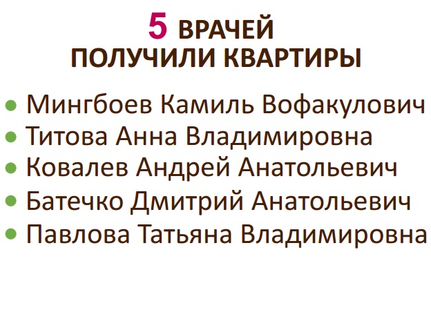 В 2015 году предоставлены 2 квартиры, 2 места в общежитии. В 2016 году квартиры получили 5 врачей: