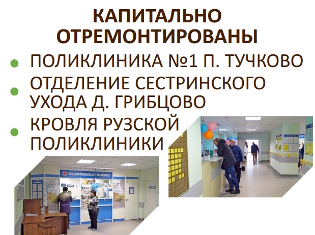 Мы уделяем серьезное внимание состоянию объектов здравоохранения. В текущем году на эти цели по программе здравоохранения выделено 40,8 млн. руб. (капитальный ремонт поликлиники № 1 п. Тучково, пищеблок и отделение сестринского ухода в д. Грибцово, кровля Рузской поликлиники).
