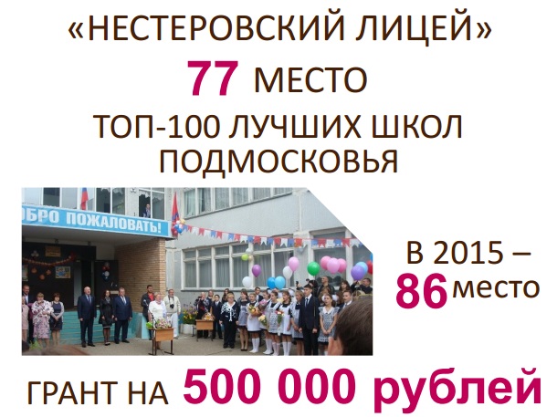 «Нестеровский лицей» вошел в Топ-100 лучших школ Подмосковья. Он занял 77 место (в 2015 – 86). Также лицей выиграл грант на сумму 500 000 рублей на приобретение компьютерного оборудования.