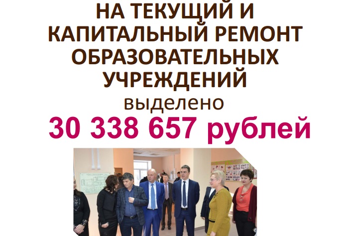 В 2016 году на текущий и капитальный ремонт образовательных учреждений за счет средств муниципального и поселенческих бюджетов выделено 30 338 657 рублей.