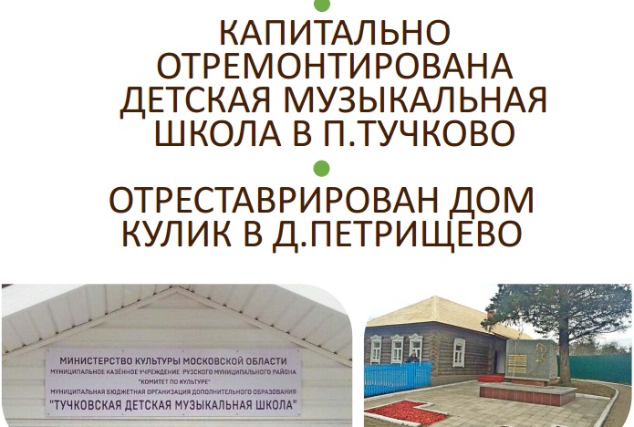 В 2016 году капитально отремонтирована музыкальная школа в Тучково, совместно с военно-историческим обществом капитально отреставрирован дом-изба Кулик в Петрищево, где провела последнюю ночь перед казнью Герой Советского союза Зоя Космодемьянская.