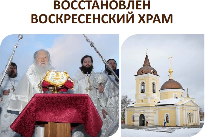 В 2016 году восстановлен Воскресенский храм в д. Воскресенское. Торжественное богослужение провел митрополит Крутицкий и Коломенский Ювеналий. Он собственноручно окропил святой водой внутреннее убранство, стены храма и прихожан.