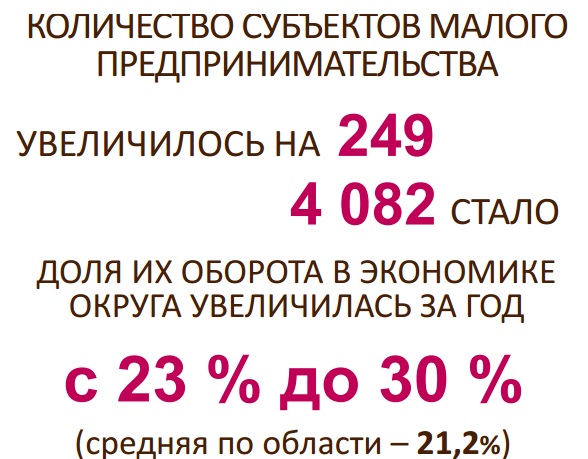 Так за 2016 год количество субъектов малого предпринимательства увеличилось на 249 и составило 4082, а доля их оборота в экономике округа увеличилась за год с 23 % до 30 % (средняя по области – 21,2 %). По количеству малых предпринимателей на количество жителей мы в вошли 10-ку лидеров по Московской области.