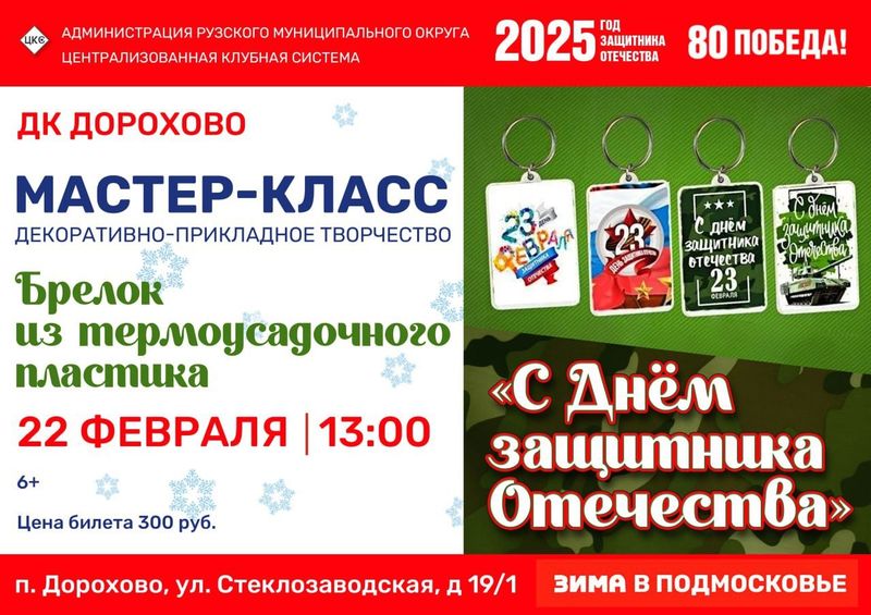 Дом культуры Дорохово приглашает всех желающих на мастер-класс «Брелок из термоусадочного пластика» 22 февраля в 13.00. Всем будет весело и интересно, участникам обеспечено хорошее настроение и заряд положительных эмоций, а поделки, созданные своими руками, будут отличными подарками ко Дню защитника Отечества и порадуют родных людей.