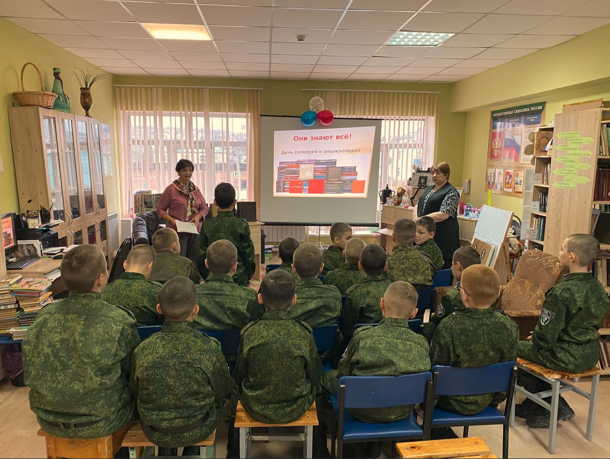 Посмотрев презентацию «Его величество словарь», учащиеся Первого казачьего кадетского корпуса имени Героя СССР Льва Доватора узнали о различиях и сходствах словарей, энциклопедий и справочников, а также о том, как словари помогают в учёбе, расширении кругозора и поиске нужной информации. Школьники ознакомились со словарями русского языка, имеющимися в библиотеке, и узнали правила их использования.