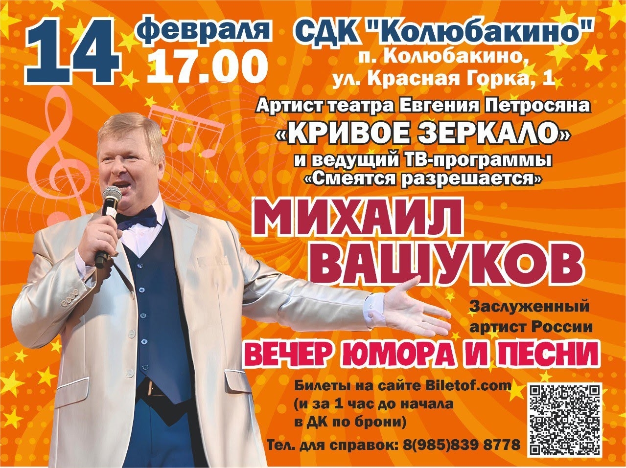 Известный артист театра Евгения Петросяна «Кривое зеркало» и ведущий программы «Смеяться разрешается», заслуженный артист России Михаил Вашуков выступит в СДК «Колюбакино». Мероприятие запланировано на 14 февраля, начало в 17:00.