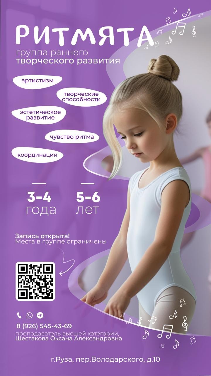 Муниципальное бюджетное учреждение дополнительного образования «Рузская детская школа искусств» приглашает в группу раннего творческого развития «Ритмята». Это уникальная возможность для вашего малыша раскрыть артистизм, творческие способности и эстетическое восприятие. Занятия направлены на развитие чувства ритма, координации движений и общей физической активности.