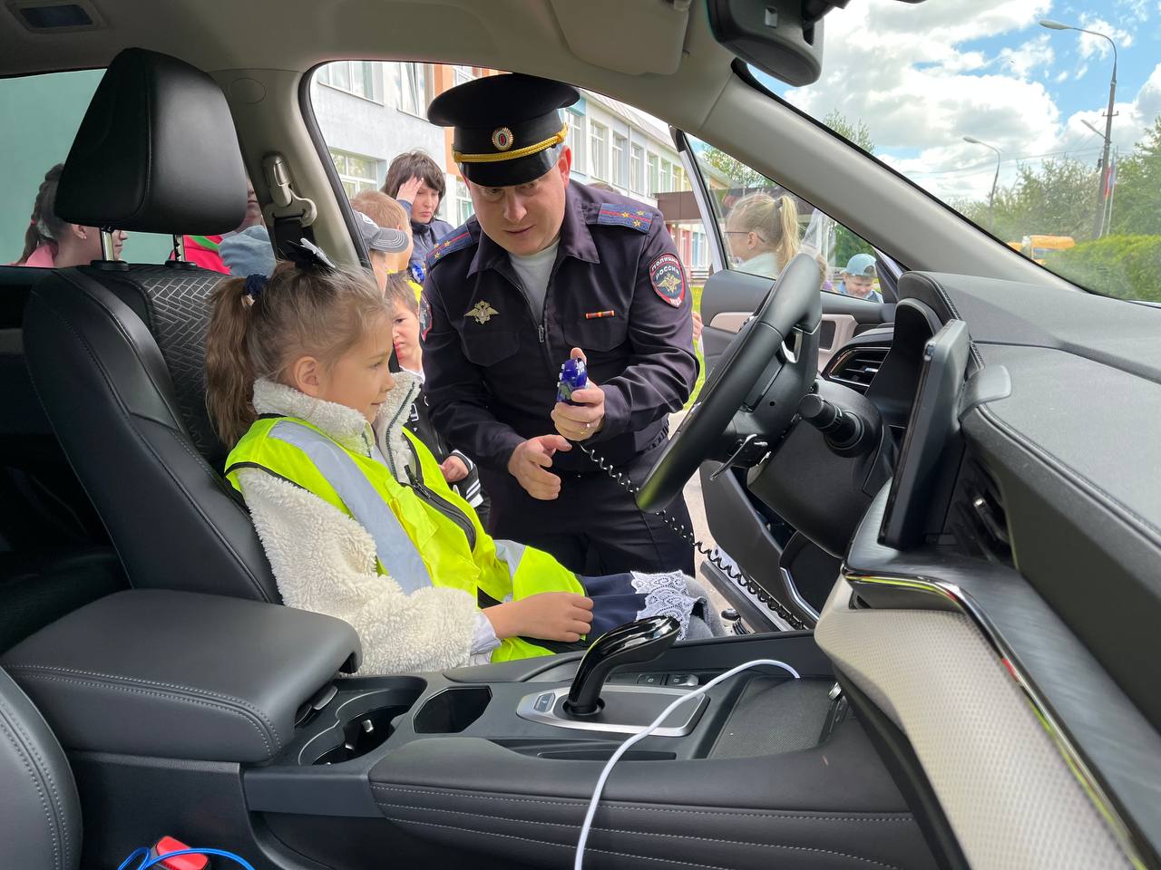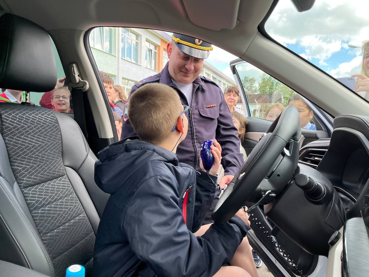 Александр Михайлович продемонстрировал работу проблесковых маячков и звуковых сигналов на патрульном автомобиле, вызвав у школьников неподдельный интерес и бурю эмоций.