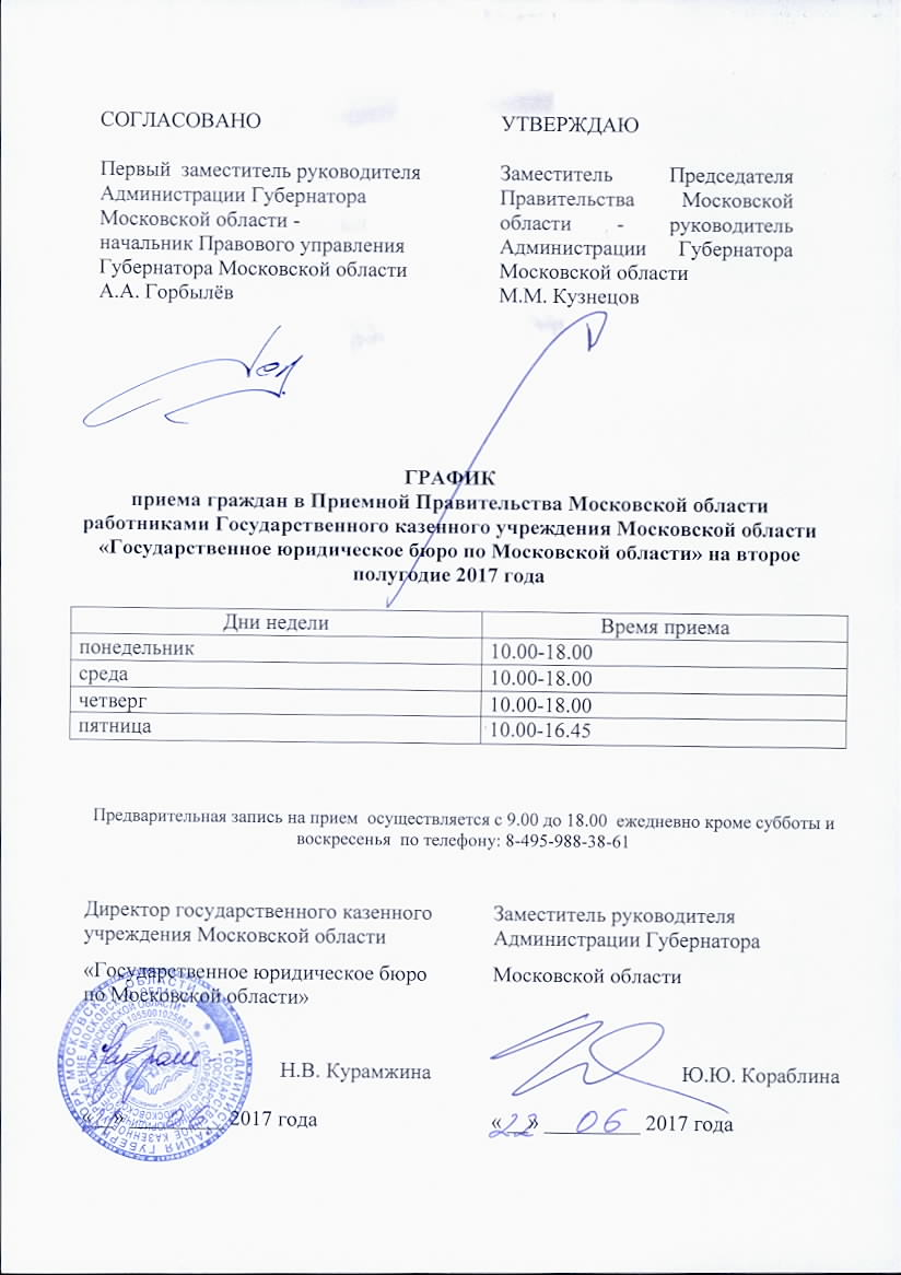График приема граждан в Приемной Правительства Московской области работниками государственного казенного учреждения Московской области "Государственное юридическое бюро по Московской области" на второе полугодие 2017 года.