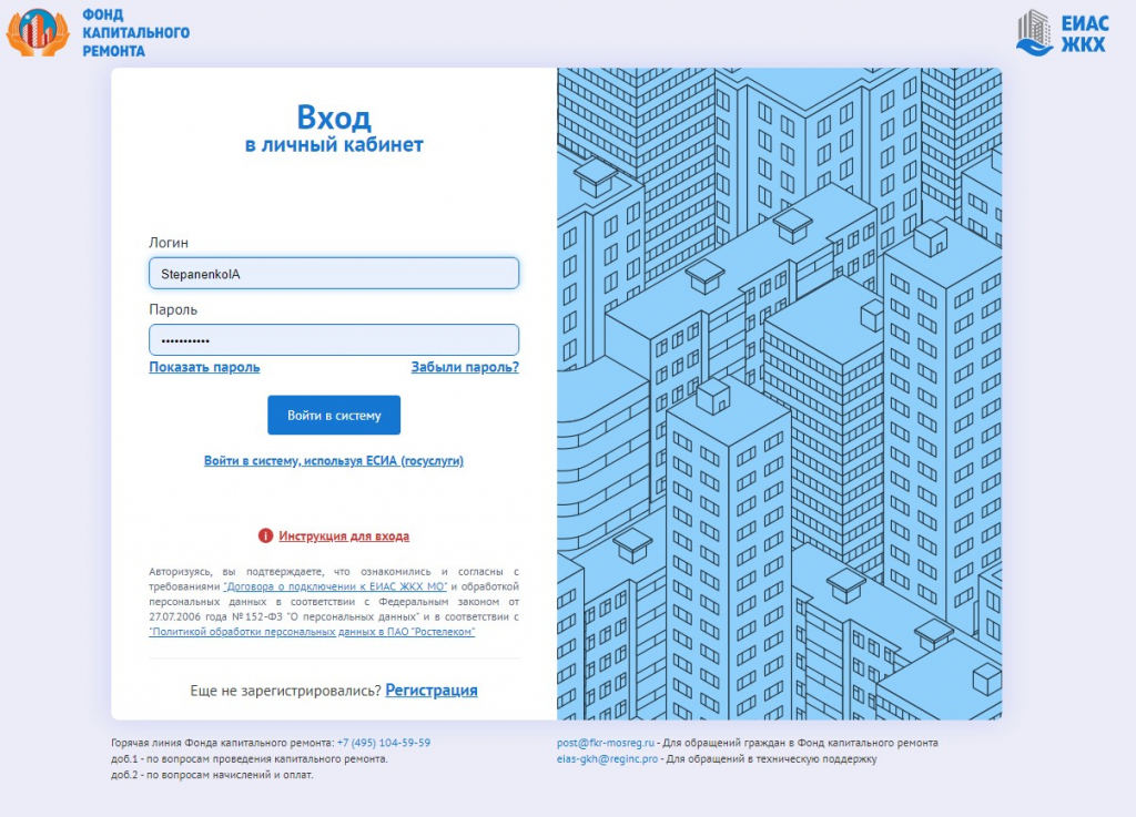 При нажатии кнопки «Личный кабинет» на главной странице сайта произойдет переадресация на страницу личного кабинета Фонда и ЕИАС ЖКХ.