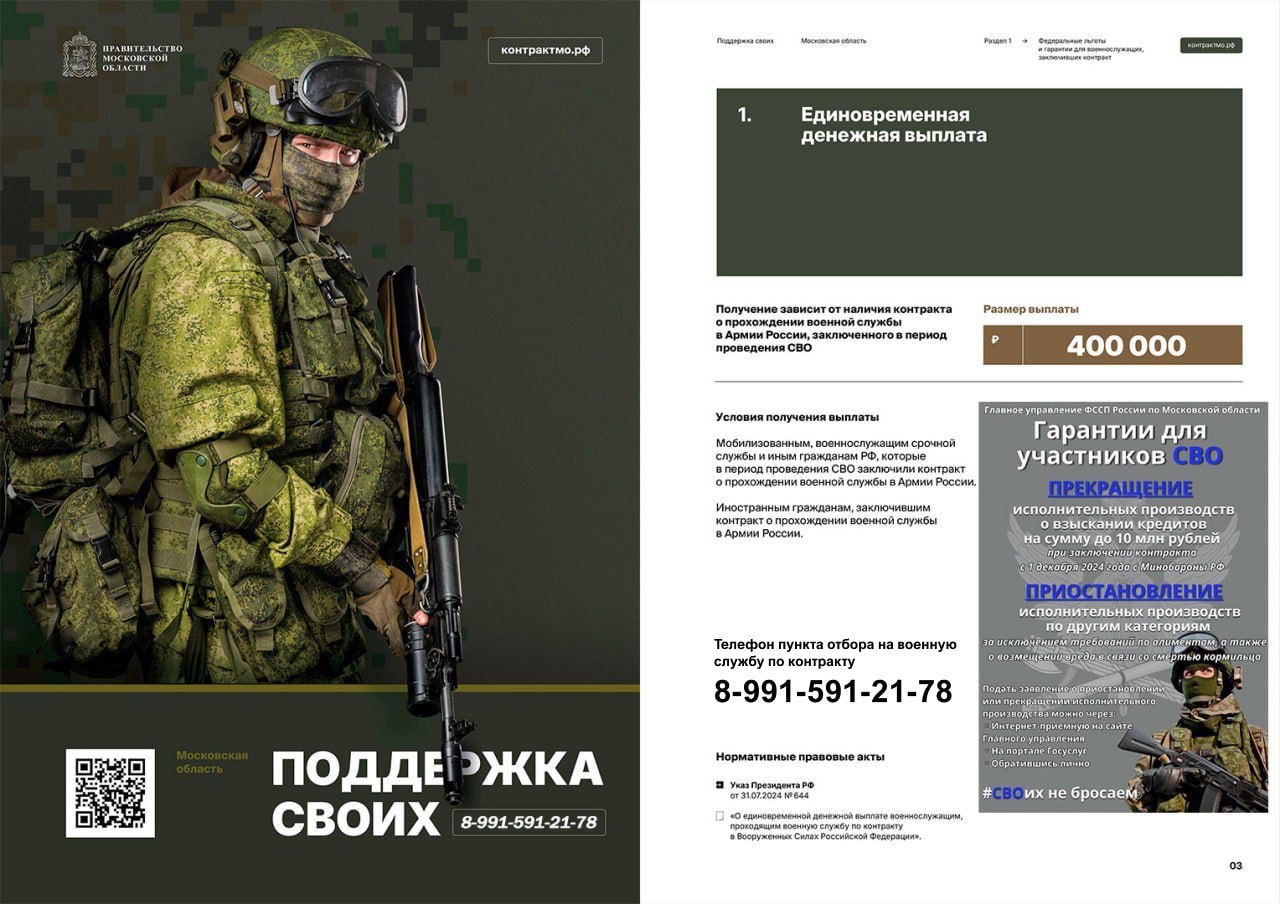 При заключении контракта о прохождении военной службы в Российской Армии в период в период проведения специальной военной операции жителям Московской области предоставляются следующие социальные гарантии: