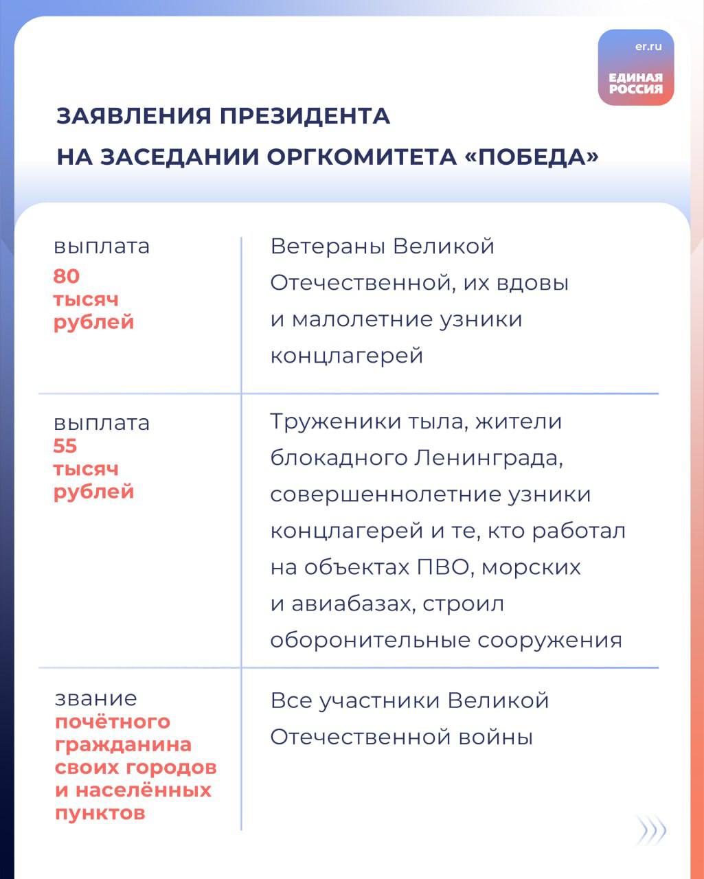 единовременную выплату в размере 80 тысяч рублей получат все ветераны, включая фронтовиков, их вдов, а также малолетних узников концлагерей;