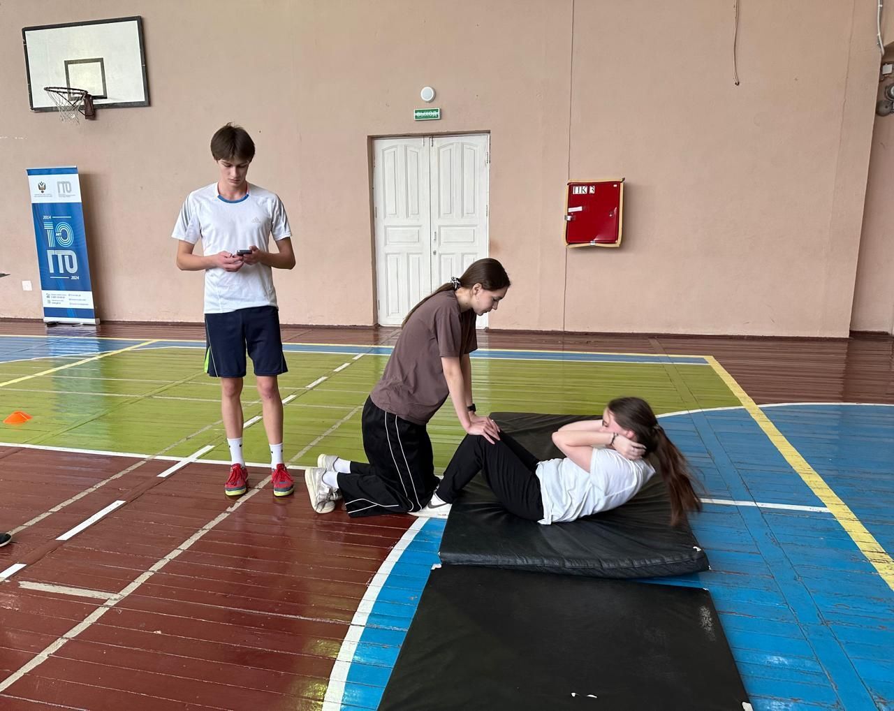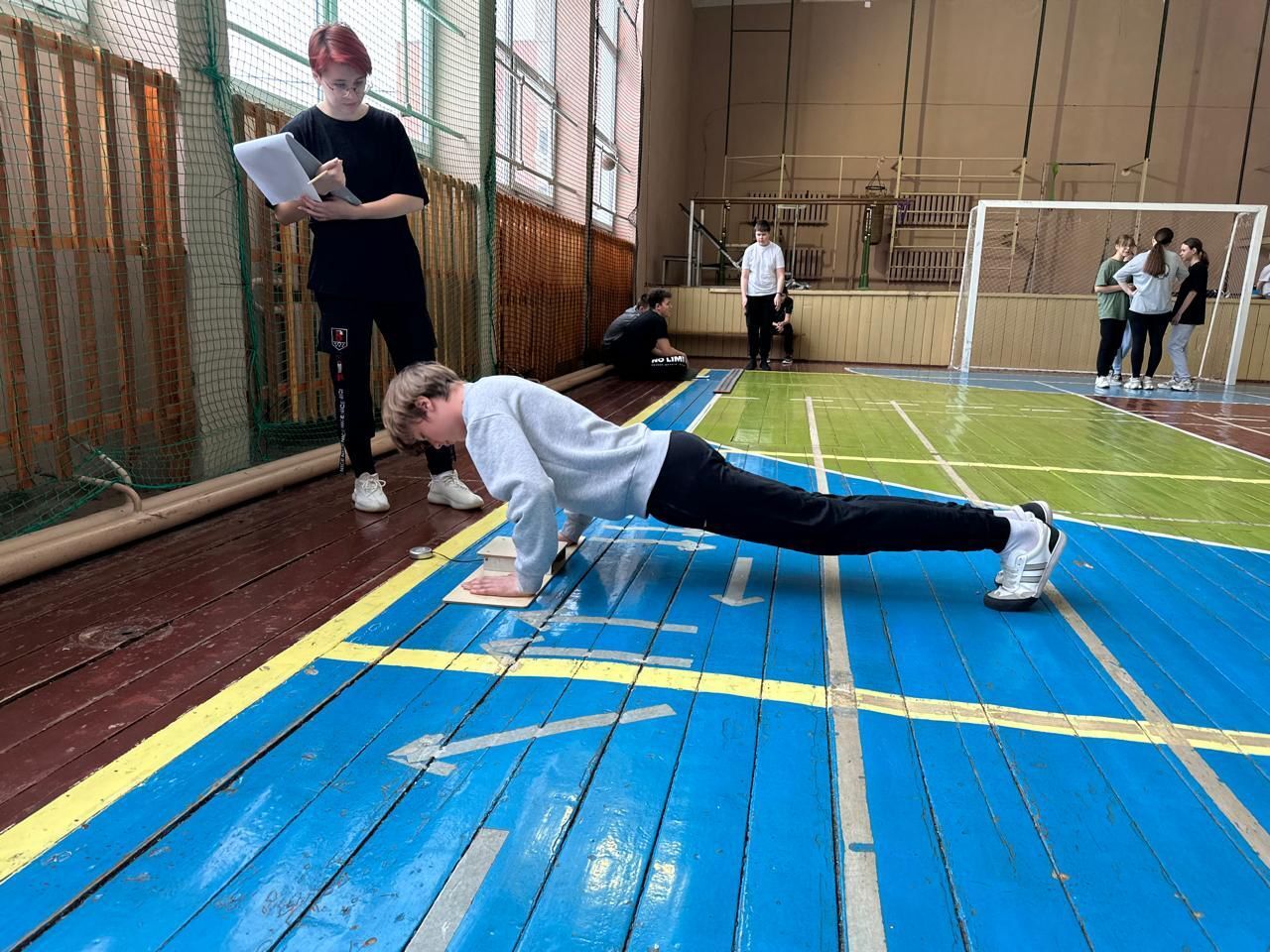 Ребята выполняли такие нормативы, как наклон вперед из положения стоя с прямыми ногами на гимнастической скамье, прыжок в длину с места толчком двумя ногами, поднимание туловища из положения лежа на спине, сгибание и разгибание рук в упоре лежа на полу, подтягивание из виса на высокой перекладине, челночный бег 3x10 м.