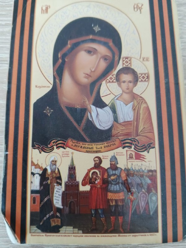 При осмотре я заметил интересный момент: помимо привычного всем изображения Богородицы с Иисусом на руках, на нижней части иконы запечатлено, как святитель Ермоген благословляет Народное ополчение во главе с Кузьмой Мининым и Дмитрием Пожарским на освобождение Москвы от захватчиков в 1612 году.