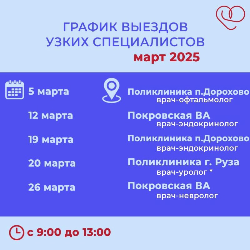 График выездов узких специалистов по подразделениям Рузской больницы на март 2025 года: