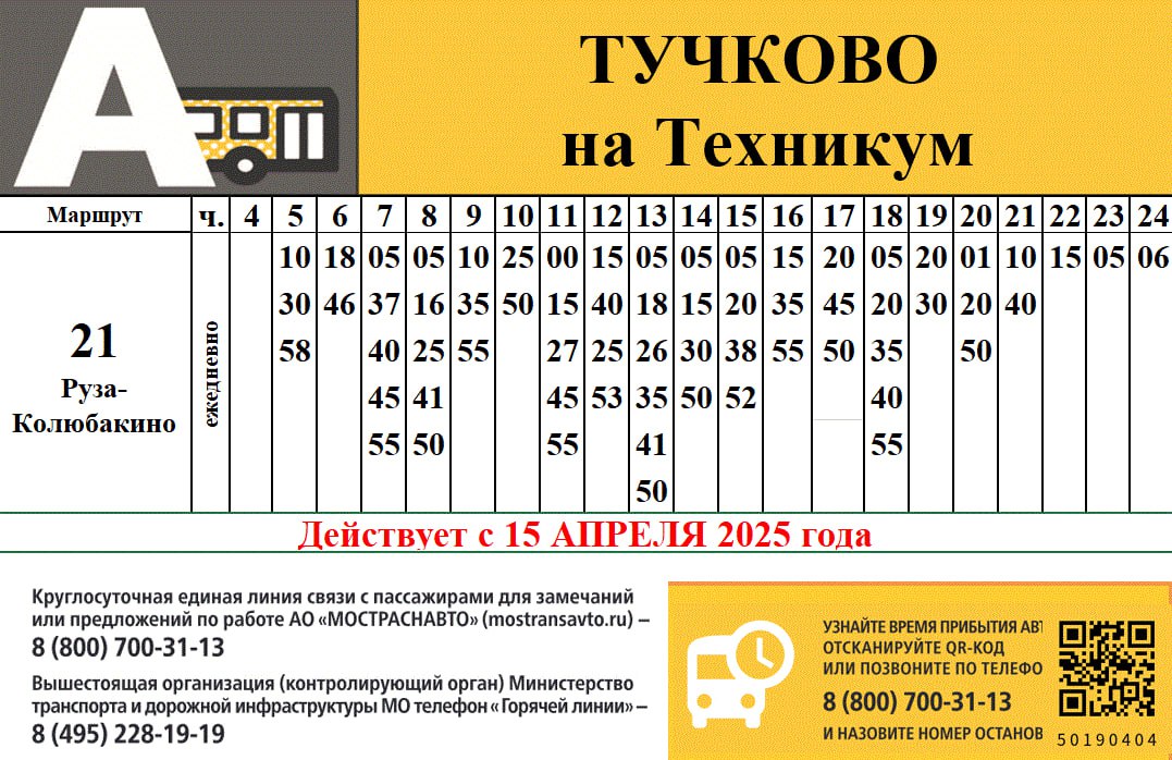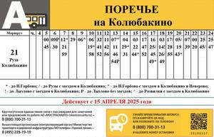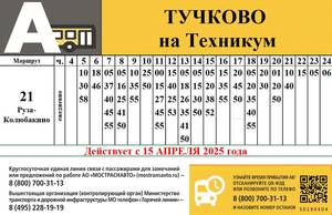 Напомним, автобусный маршрут №21 будет разделён на два участка: Тучково – Техникум и Поречье – Колюбакино. Расписание синхронизировано с учётом пересадки пассажиров и проходом по мосту. Пересадка будет бесплатная – оплата проезда совершается один раз. Сохранятся все остановки и заезды в Новогорбово, Васильевское и Лызлово.