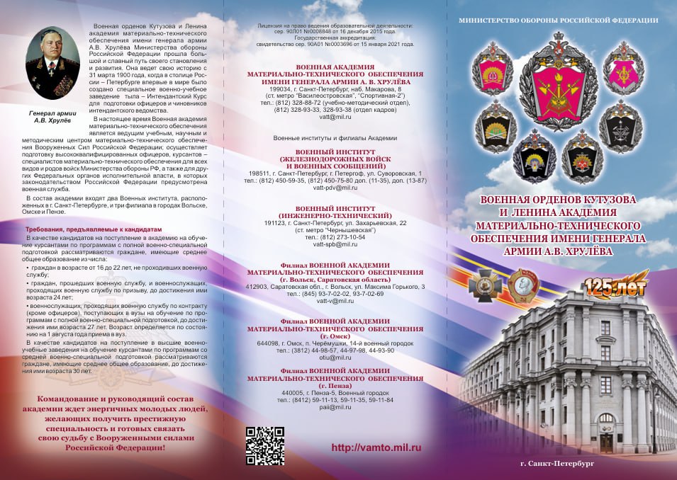 Военный комиссариат Можайского и Рузского городских округов Московской области проводит набор выпускников средних общеобразовательных школ и образовательных учреждений среднего профессионального образования для поступления в Военную академию материально-технического обеспечения имени генерала армии А.В. Хрулёва.