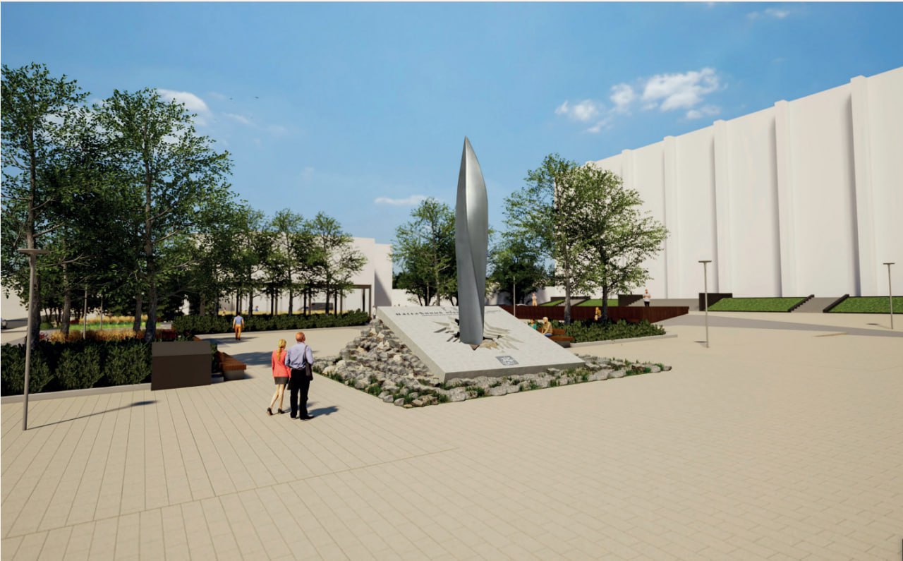 Помимо установки стелы, в рамках благоустройства прилегающей территории будут проведены следующие работы: устройство газонов и цветников, высадка деревьев, оборудование тротуаров, установка скамеек, освещение и архитектурно-планировочная подсветка.