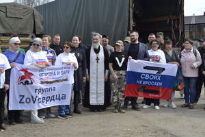 Автомобили с грузом освятил отец Олег из храма поселка Колюбакино. Собравшиеся записали приветственные речи в адрес военнослужащих и поздравления с Пасхой.