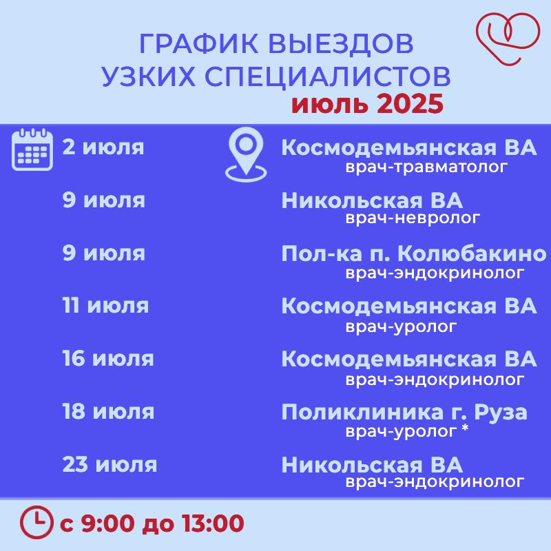Жителей Рузского муниципального округа знакомят с графиком выездов узких специалистов по подразделениям Рузской больницы на июль 2025 года.