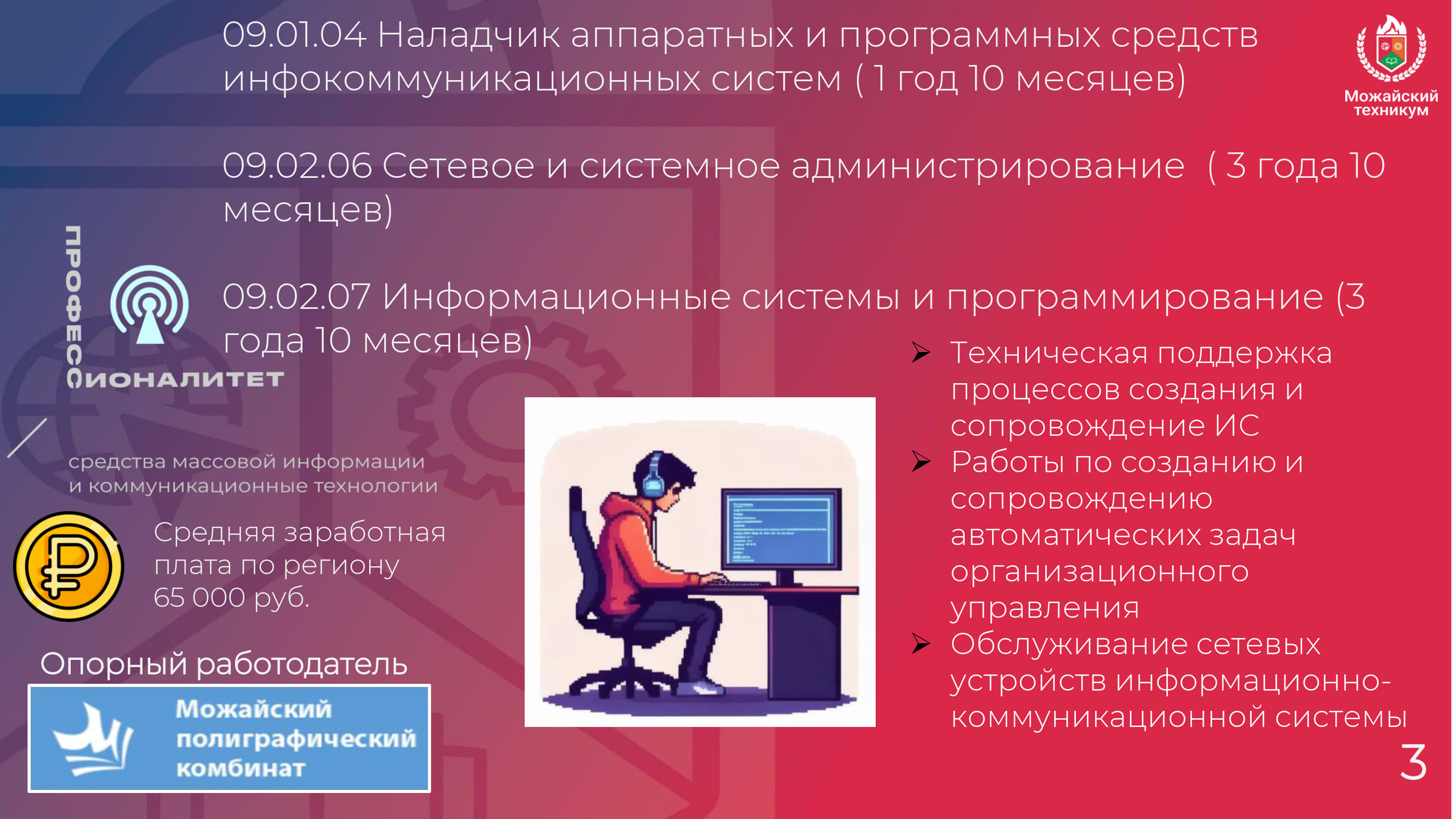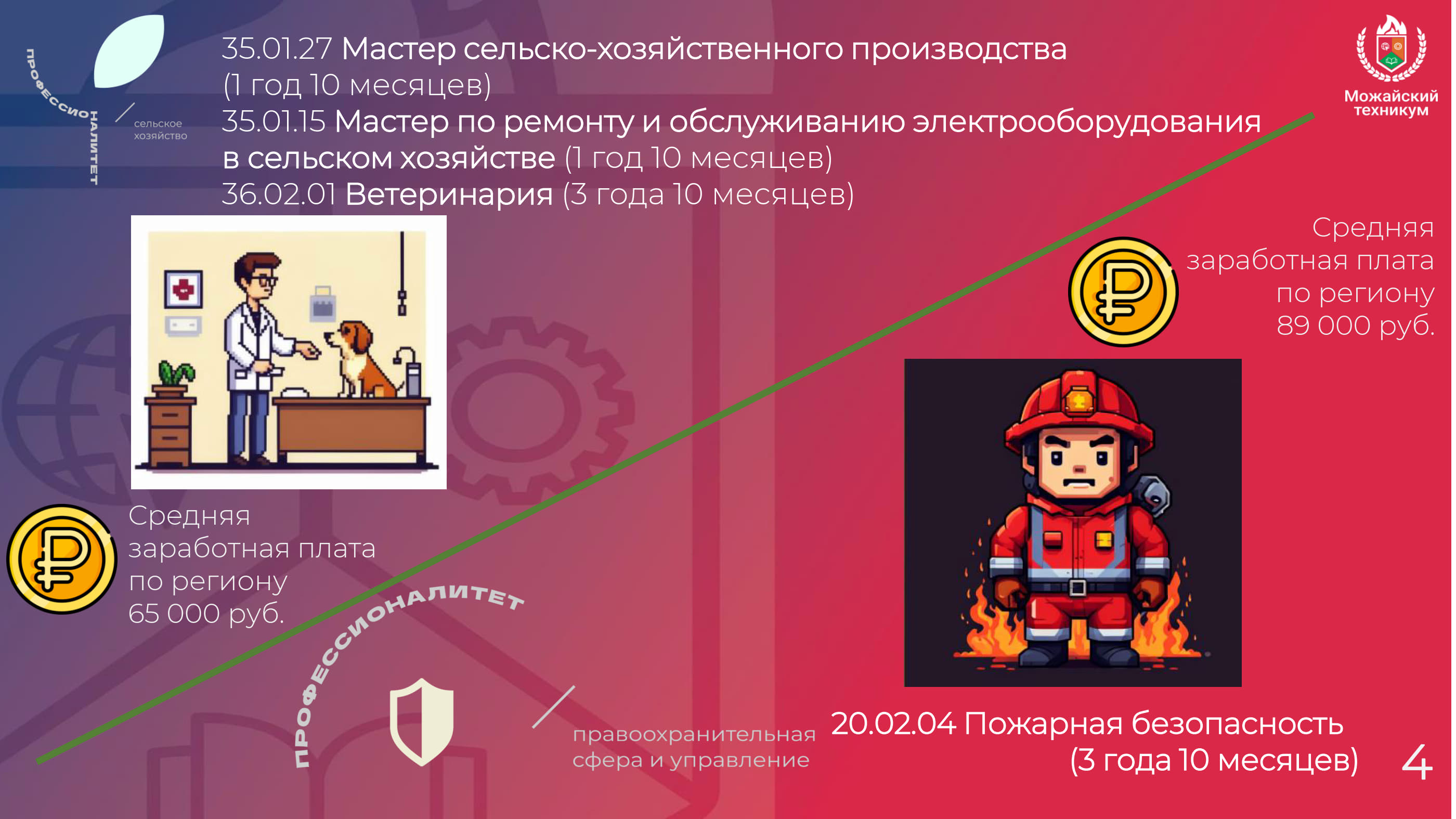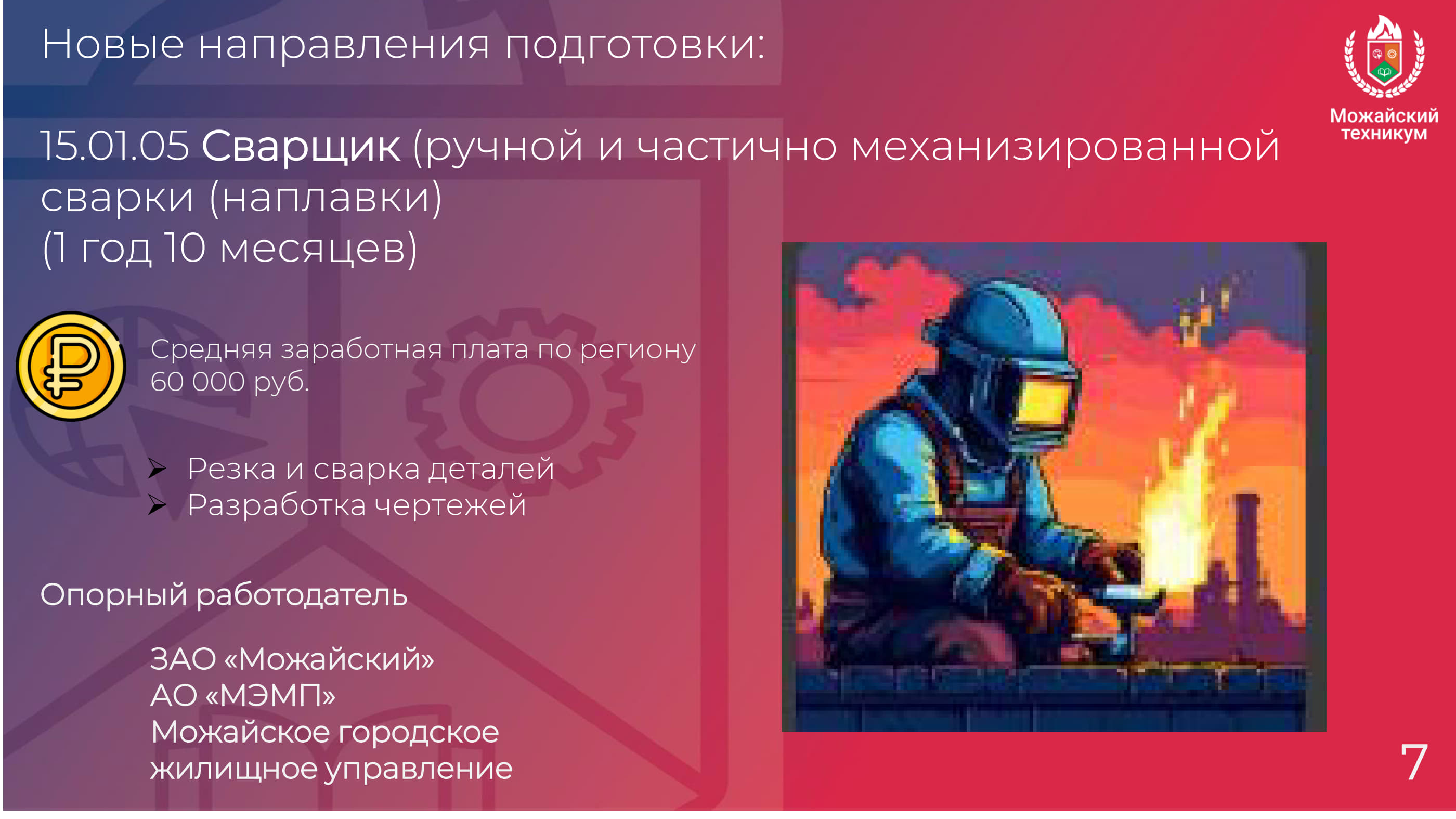 Выбирай любую из профессий себе по душе и подавай документы через Госуслуги или приходи в Можайский техникум с документами, если тебе нужна помощь.