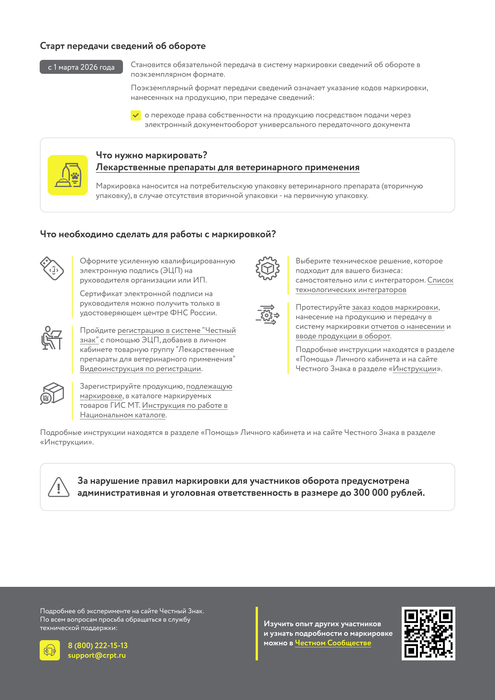 С 1 марта 2025 года вступили в силу требования о передаче в систему маркировки сведений о розничной продаже ветеринарных препаратов.