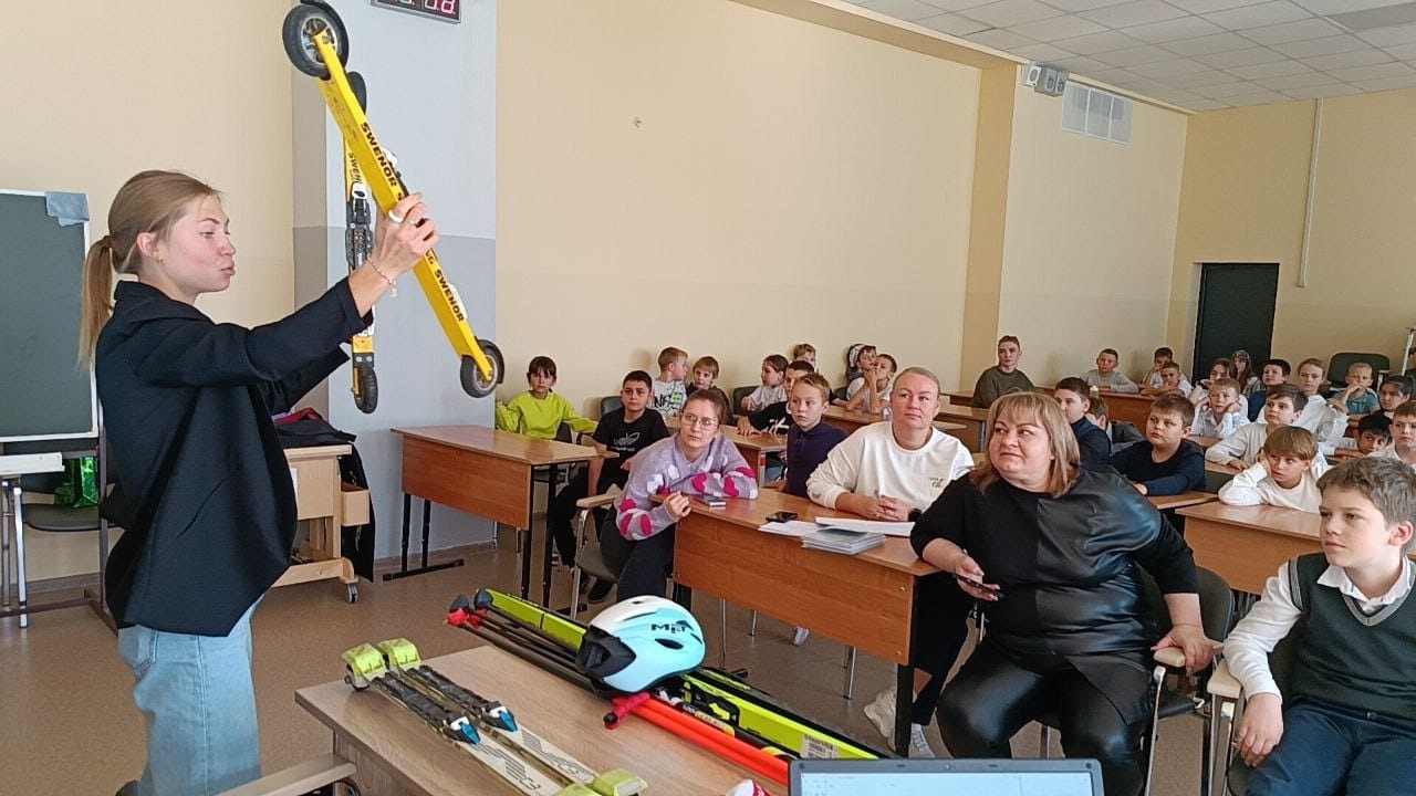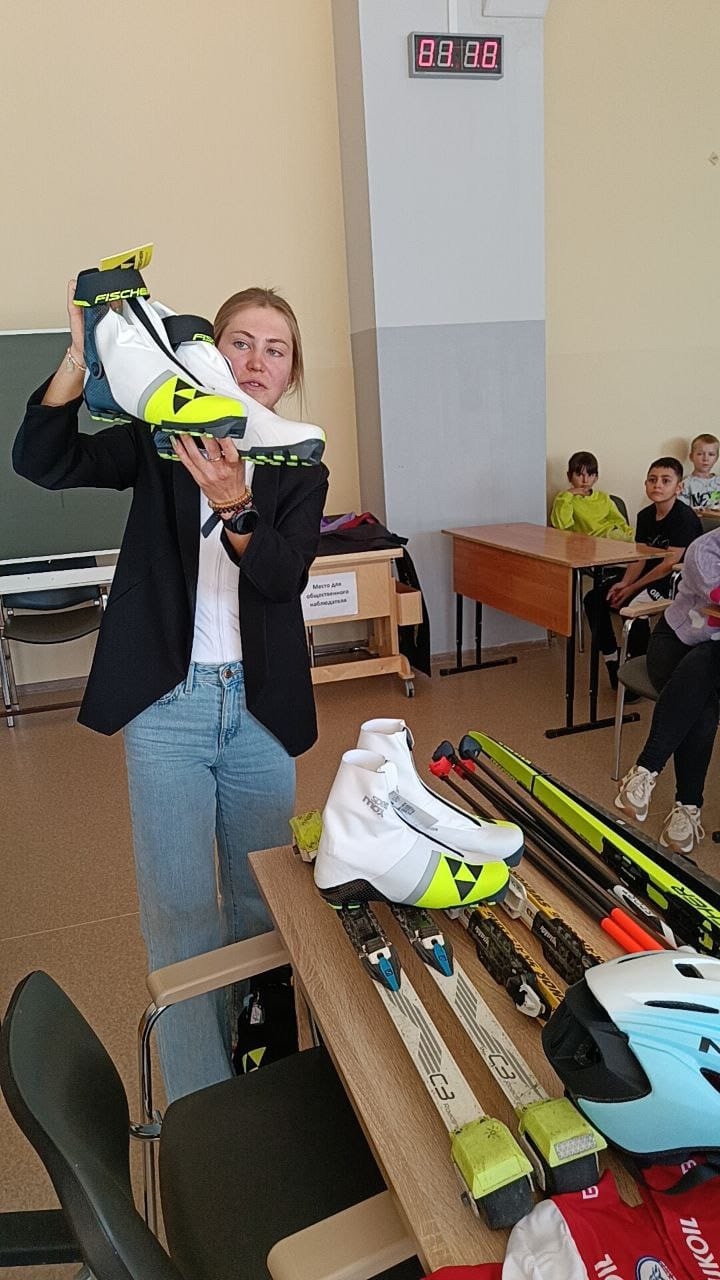 Екатерина ознакомила ребят с экипировкой лыжника и лыжероллера, показала видеофильм с тренировочными моментами, продемонстрировала свои самые ценные награды. Вместе с ребятами, а их было немало, 150 человек, провела разминку и увлекательные смешные эстафеты.