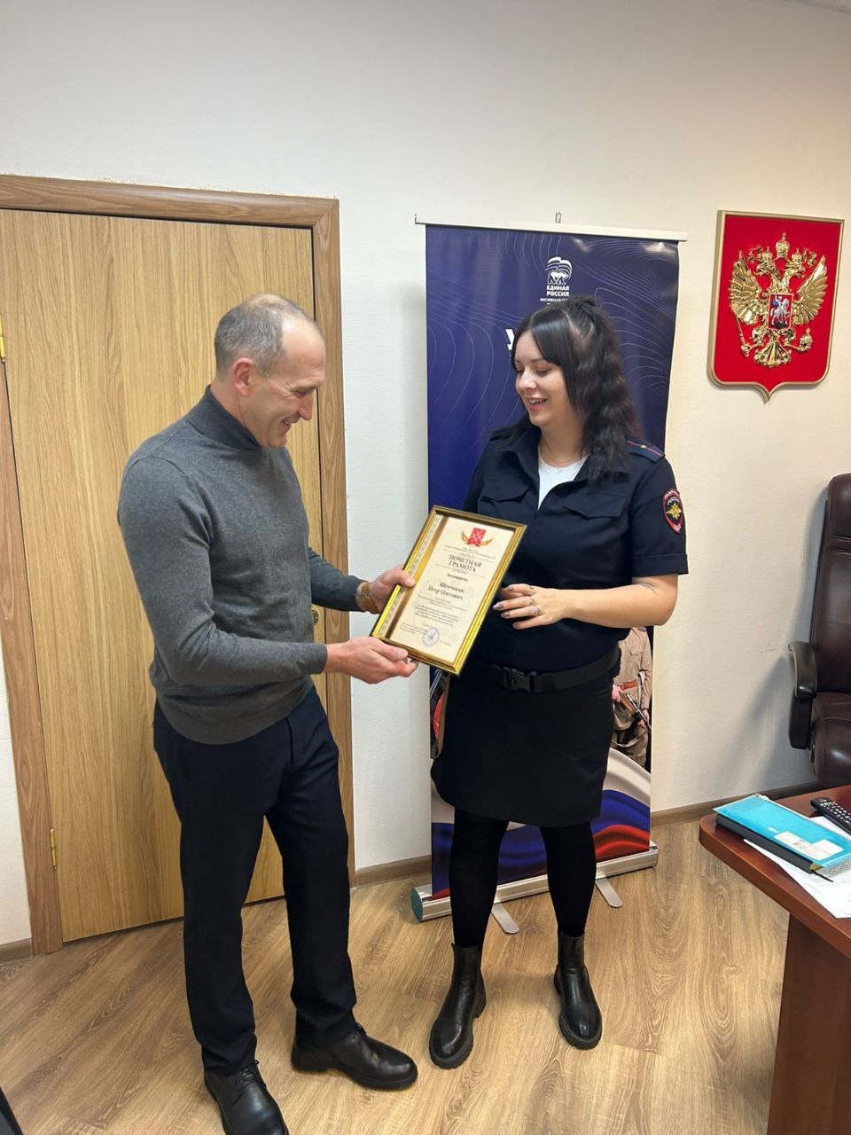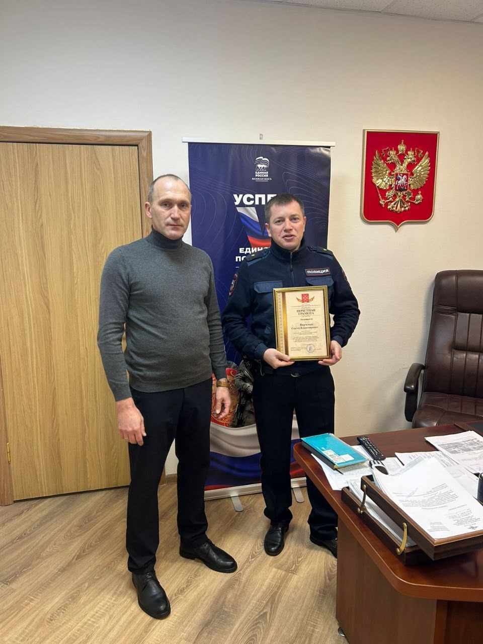 В рамках партийного проекта «Успех V единстве поколений» депутат фракции «Единая Россия» Совета депутатов Рузского муниципального округа Андрей Рыбальченко посетил Дороховское отделение полиции, чтобы лично поздравить сотрудников с праздником. В начале встречи депутат вручил почетные грамоты в знак уважения и признательности за их службу.