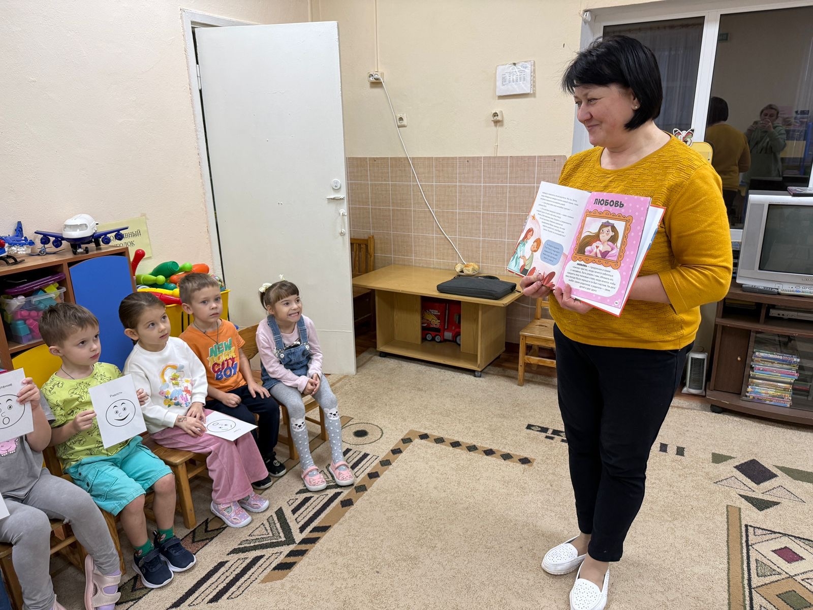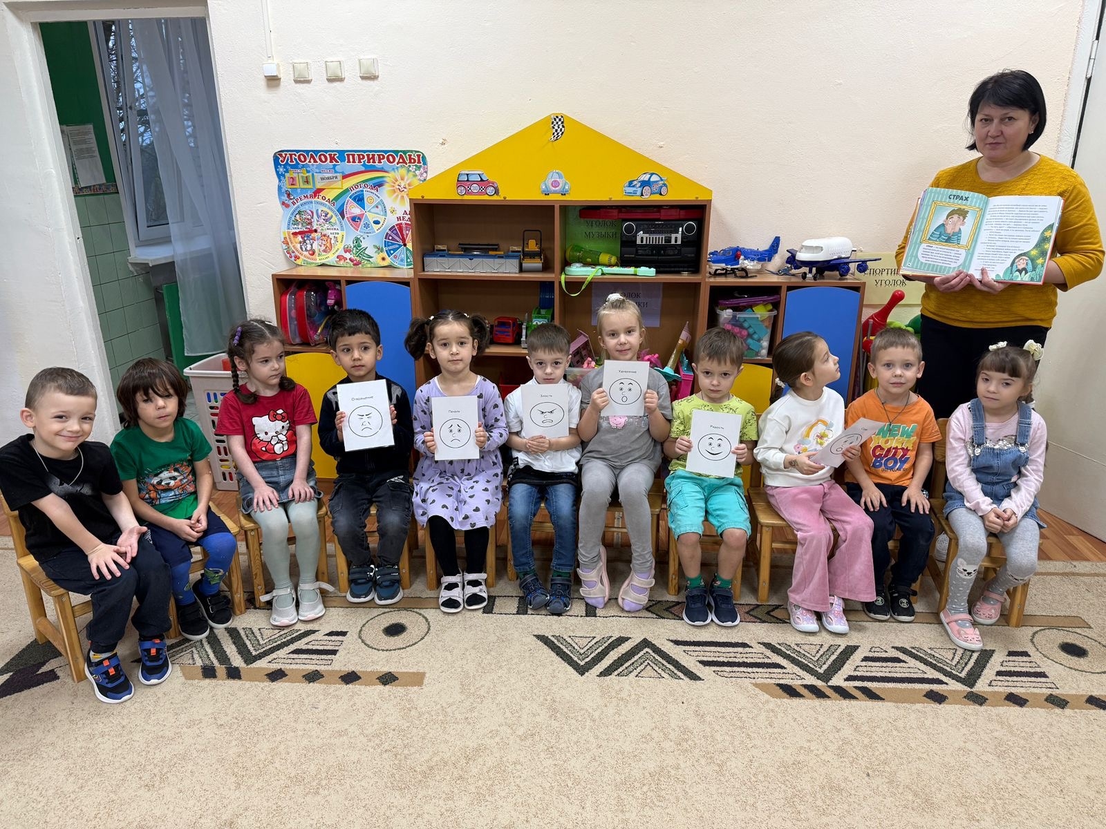 Ребята под руководством воспитателя Пилявской С.В. изучили эмоции с помощью карточек, а также послушали познавательную сказку, как эмоции помогают детям.