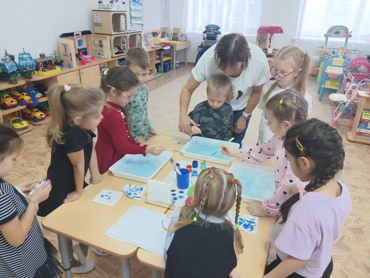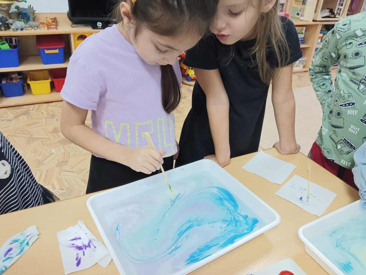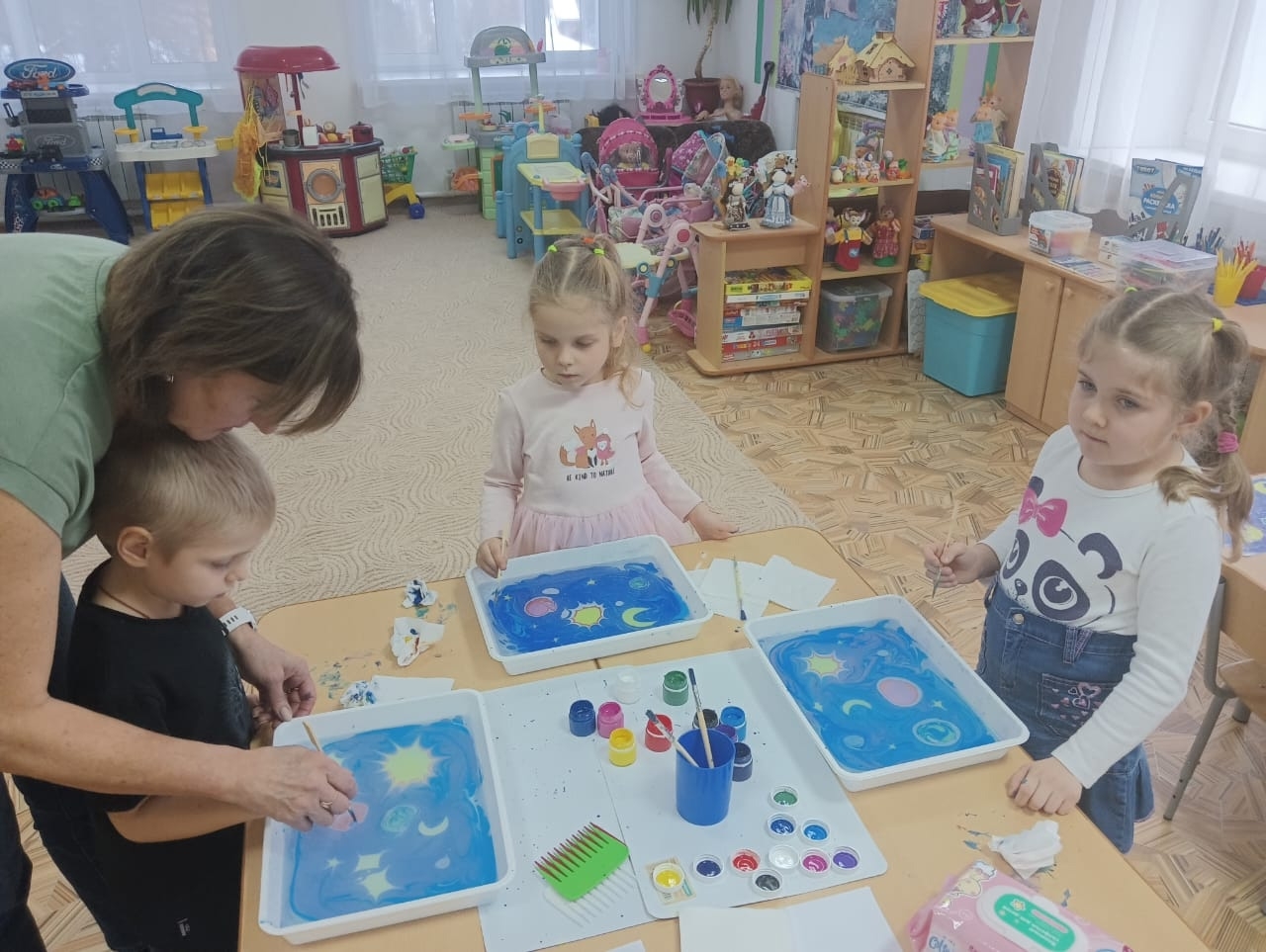 Дети с увлечением наблюдали, как капельки краски распространяются по поверхности воды, создавая удивительные фигуры и узоры. Ребята с удовольствием упражнялись в рисовании космоса и подводного мира.