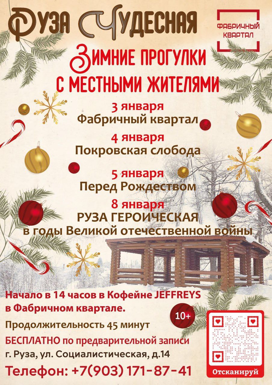 «Дорогие жители и гости Рузского округа! Культурный проект «Руза Чудесная» открывает сезон зимних прогулок по нашему прекрасному городу! Это не просто экскурсии – это душевные встречи-путешествия, где каждый найдёт что-то особенное для себя!