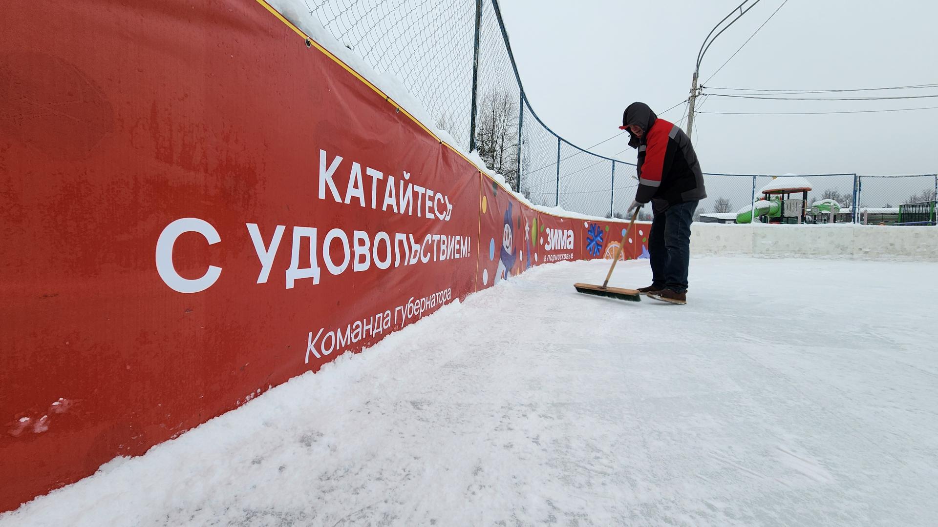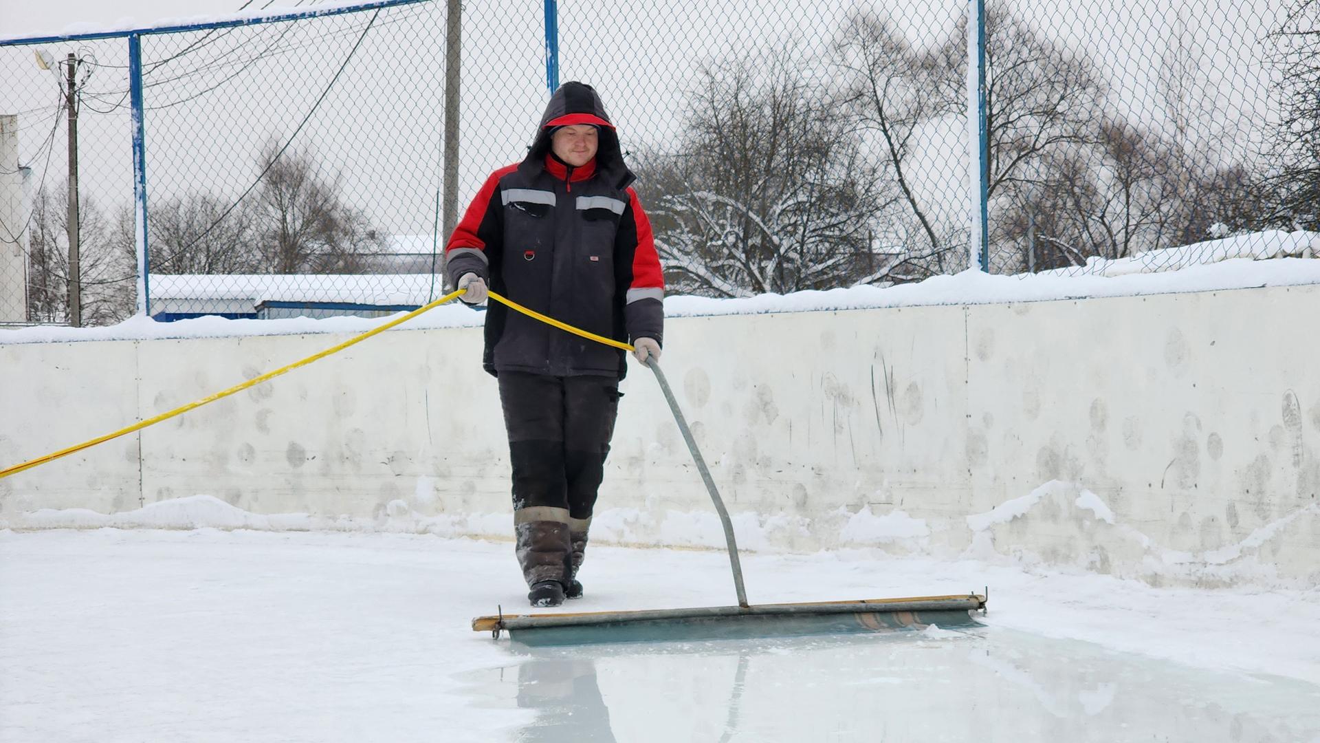 На хоккейной коробке стадиона «Урожай» сотрудники спортивной школы «Руза» создают безупречный лёд после прошедших метелей. Ровную гладь они формируют кропотливо, вручную.