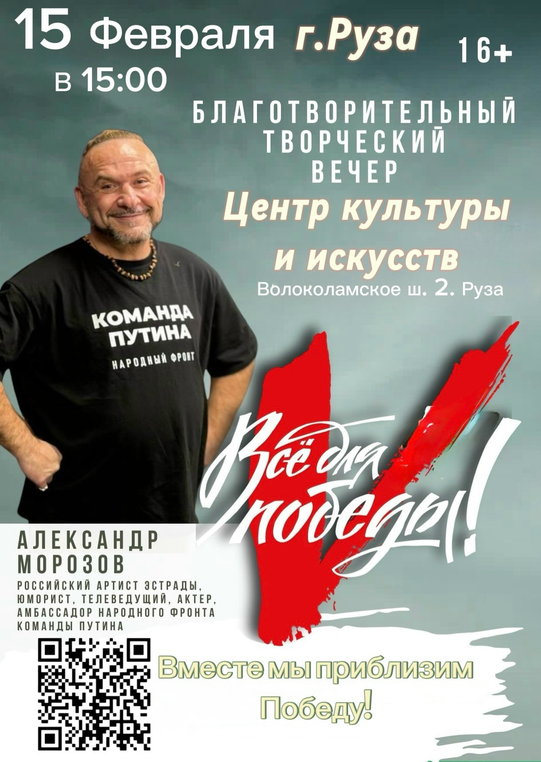 15 февраля в 15 часов в Центре культуры и искусств Рузы состоится благотворительный творческий вечер Александра Морозова – известного российского артиста эстрады, юмориста, телеведущего и актёра.