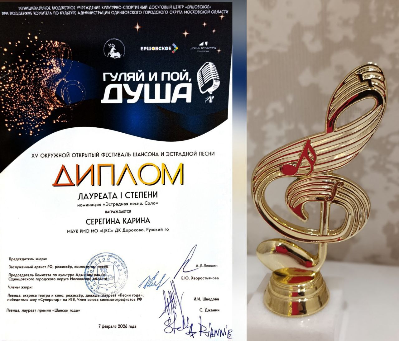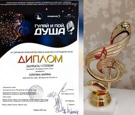 Певица Карина Серёгина из Рузского муниципального округа стала лауреатом первой степени XV юбилейного открытого фестиваля‑конкурса шансона и эстрадной песни «Гуляй и пой, душа», прошедшем 7 февраля в ДК «Каринское» в Одинцовском округе.