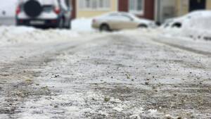Параллельно с ручной уборкой на проездах и парковках работает тяжёлая техника. Трактор методично срезает наледь с проезжей части, освобождая места для парковки личного транспорта жильцов. Те участки, где асфальт уже очищен до твёрдого покрытия, дорожники обрабатывают технической солью. Реагент растопит остатки льда и не даст влаге замёрзнуть вновь.