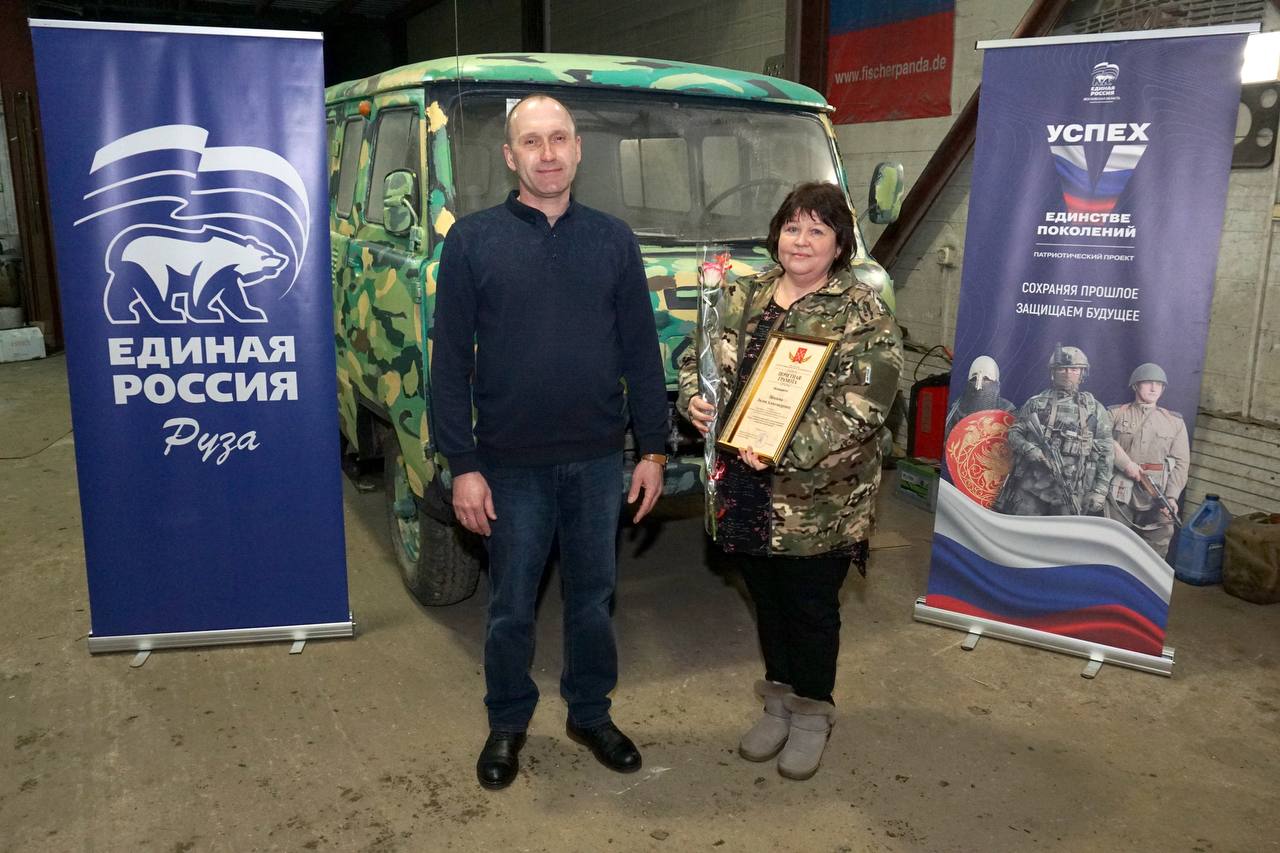 Заместитель главы Рузского муниципального округа Людмила Егорова совместно с депутатом фракции «Единая Россия» Андреем Рыбальченко наградила юных художников Дороховской детской школы искусств за роспись автомобиля УАЗ, предназначенного для отправки бойцам специальной военной операции.