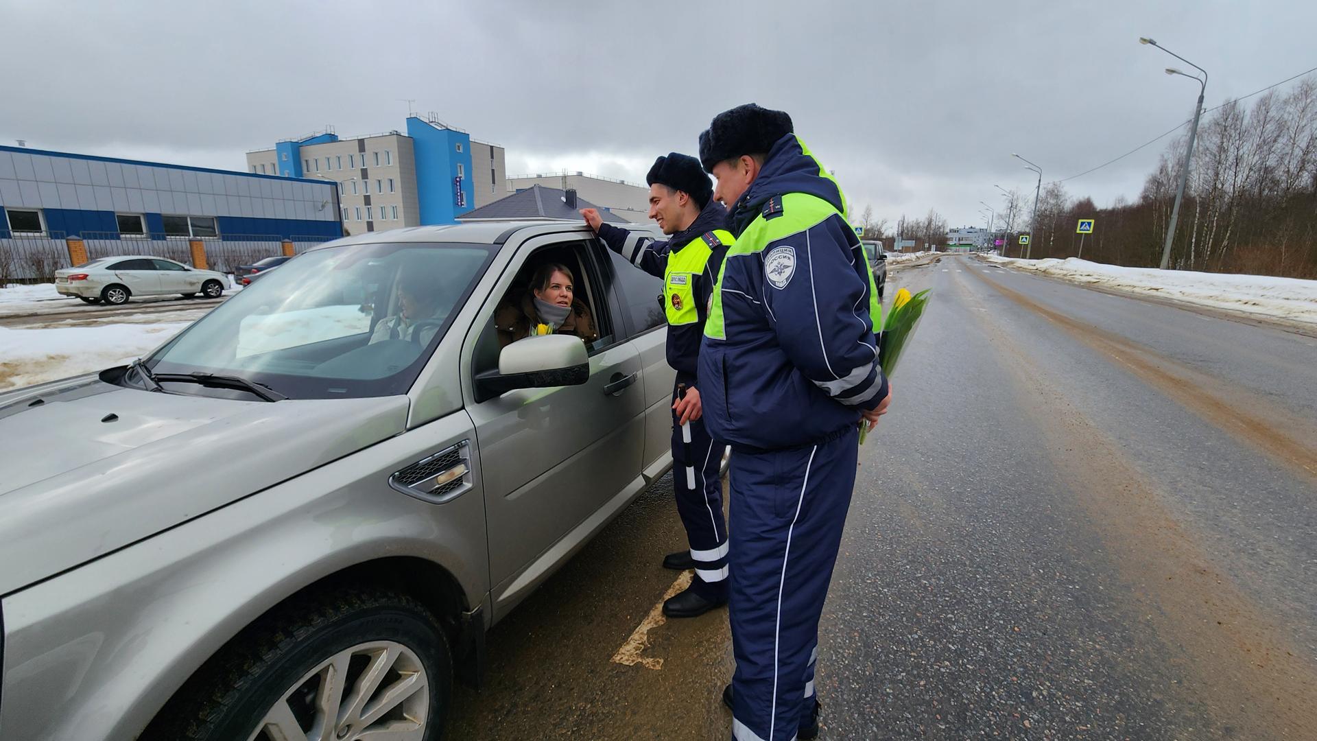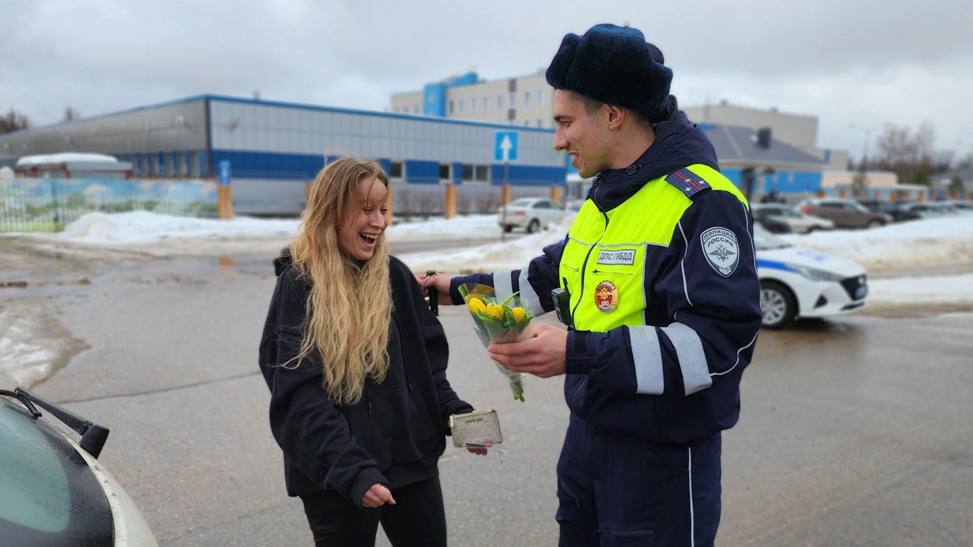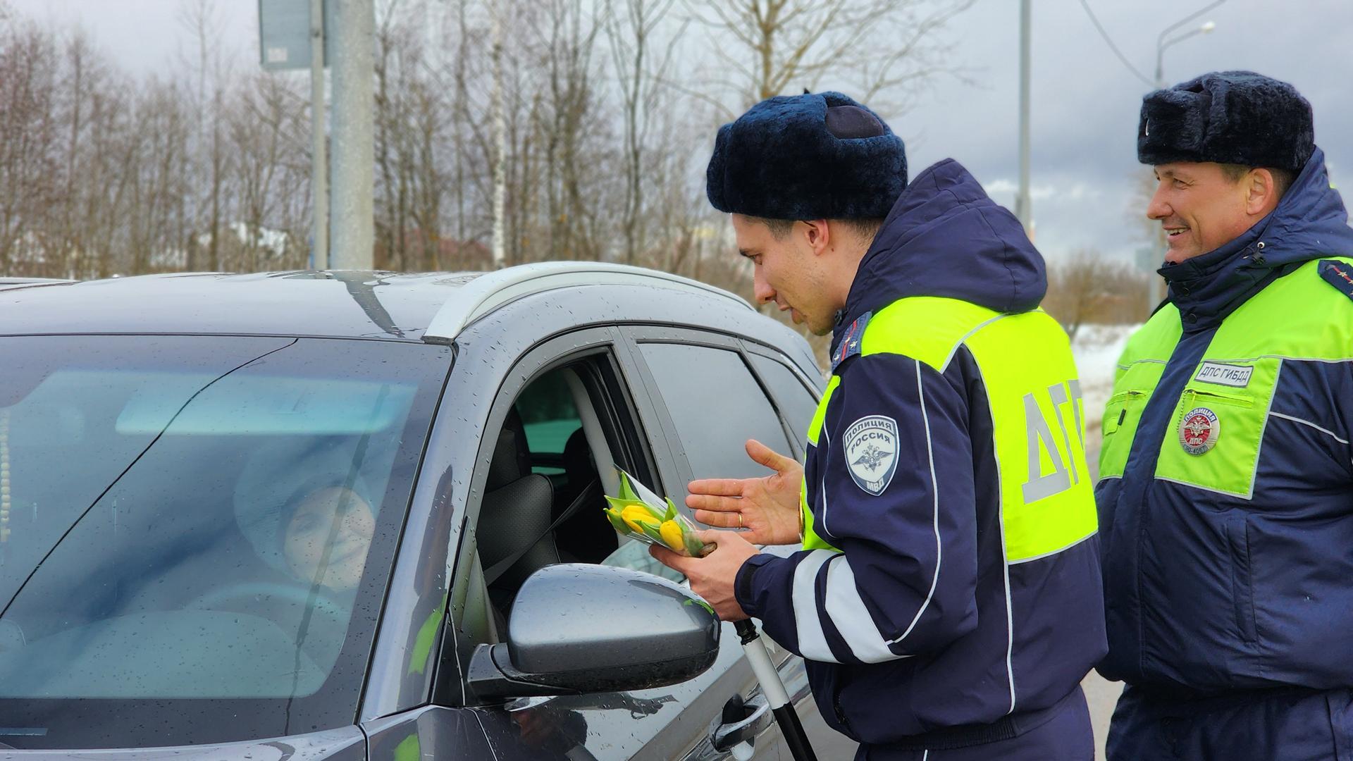 Сотрудники ГИБДД поздравили женщин-водителей Рузы с наступающим 8 Марта