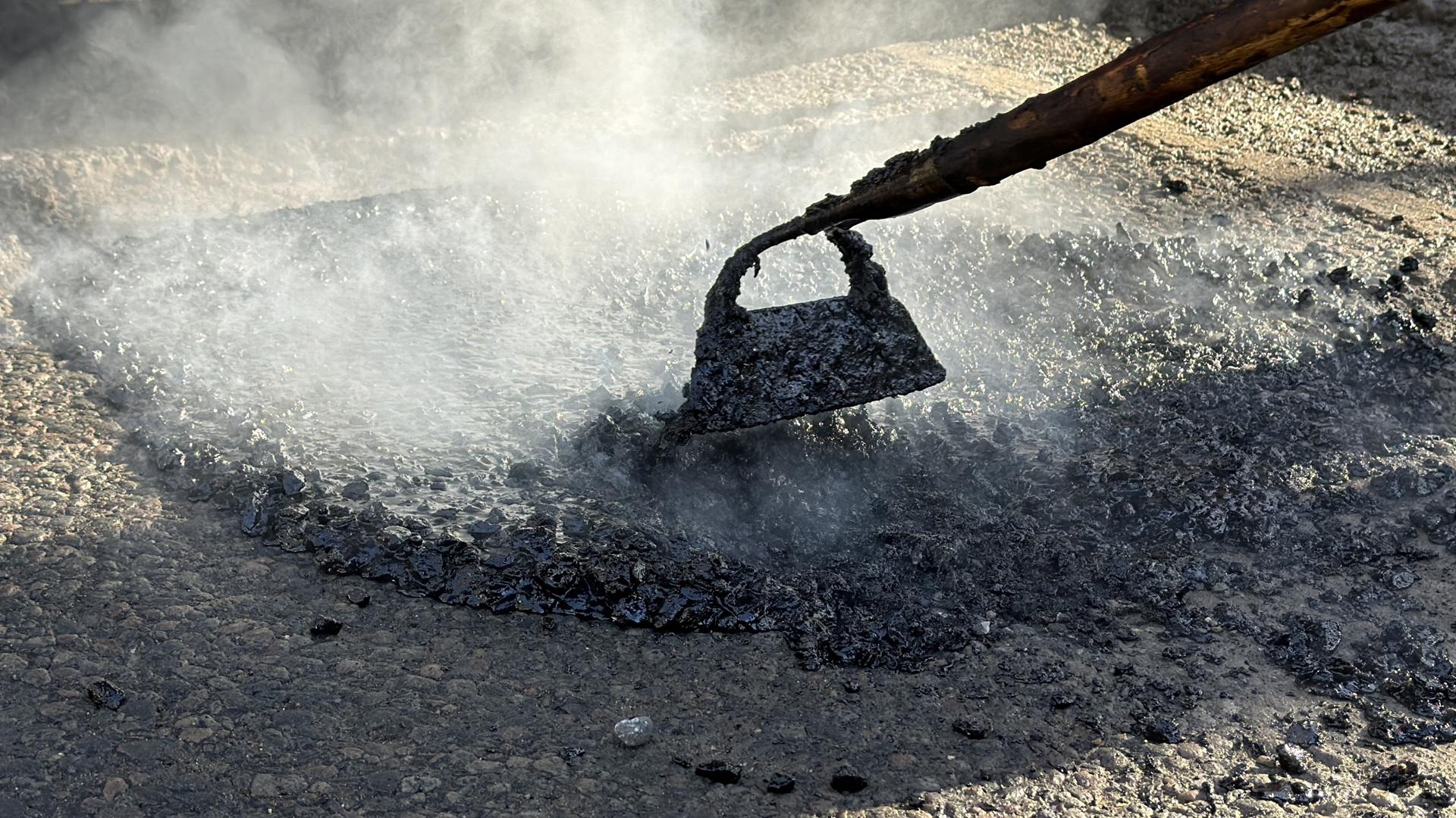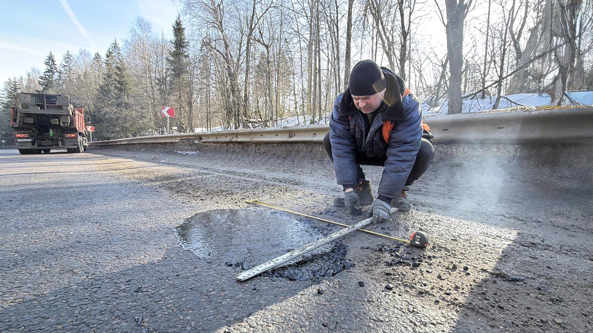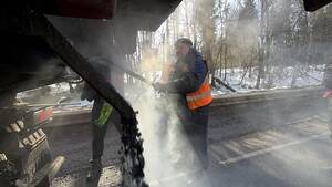 Чтобы привести трассу в порядок, рабочие применяют современную технологию. Каждое повреждение дорожного полотна тщательно подготавливают, после чего заполняют асфальтобитумной смесью.