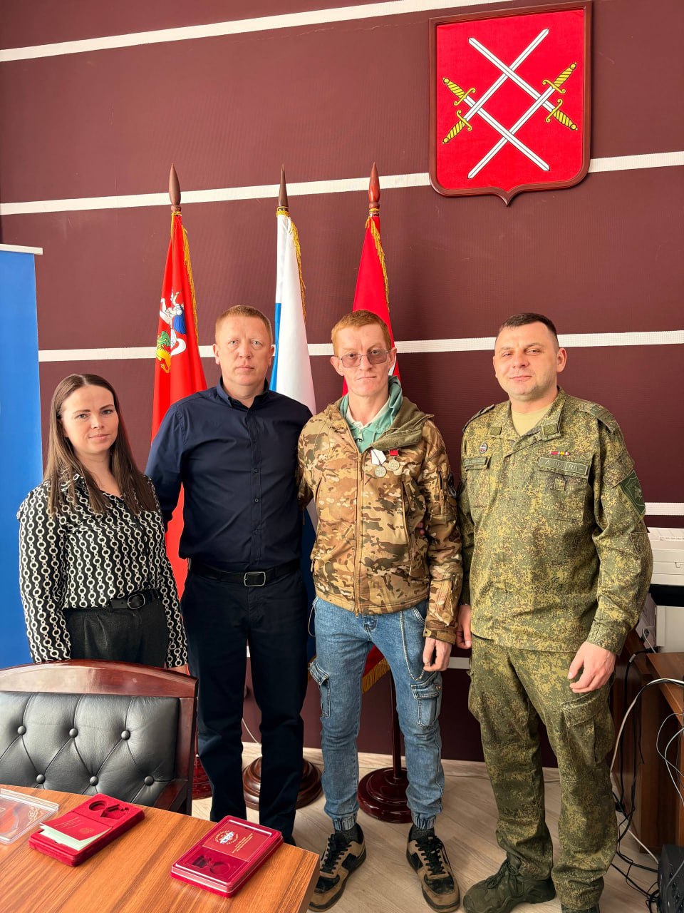 Заместитель главы Рузского муниципального округа Дмитрий Пушкин совместно с руководителем Рузского отделения ассоциации ветеранов СВО Московской области и координатором Государственного фонда «Защитники Отечества» Татьяной Ванюшкиной вручили участникам СВО государственные и ведомственные награды, а также членские карты ассоциации.