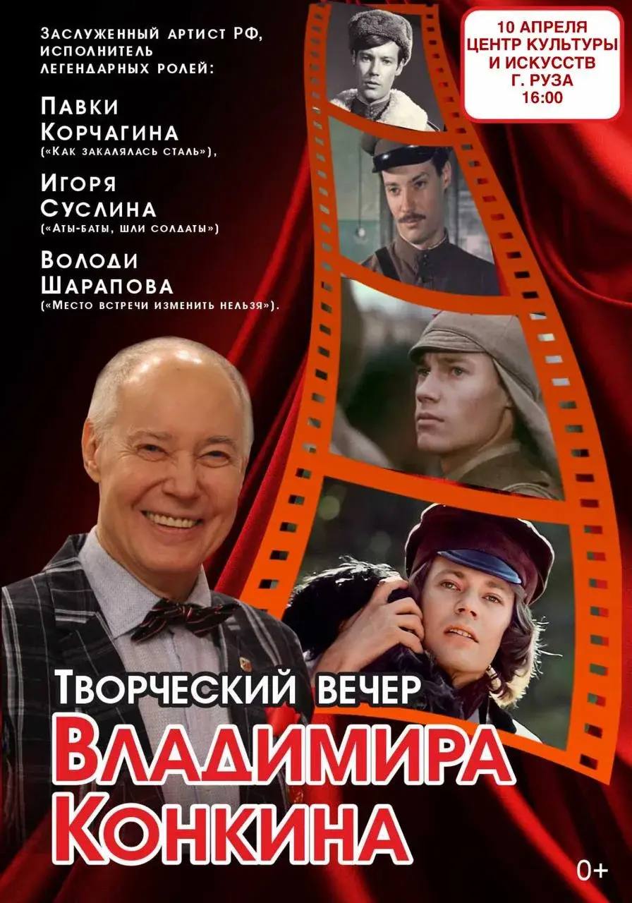 Встреча с артистом пройдёт в ЦКиИ Рузы в формате доверительного разговора. Владимир Конкин поделится историями из своей творческой биографии, расскажет о работе над известными ролями и ответит на вопросы зрителей.