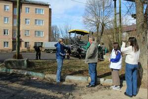 Участники проверки совместно оценили текущий этап работ: проверили качество укладки асфальтобетонной смеси, соблюдение технологических норм и график выполнения ремонта.