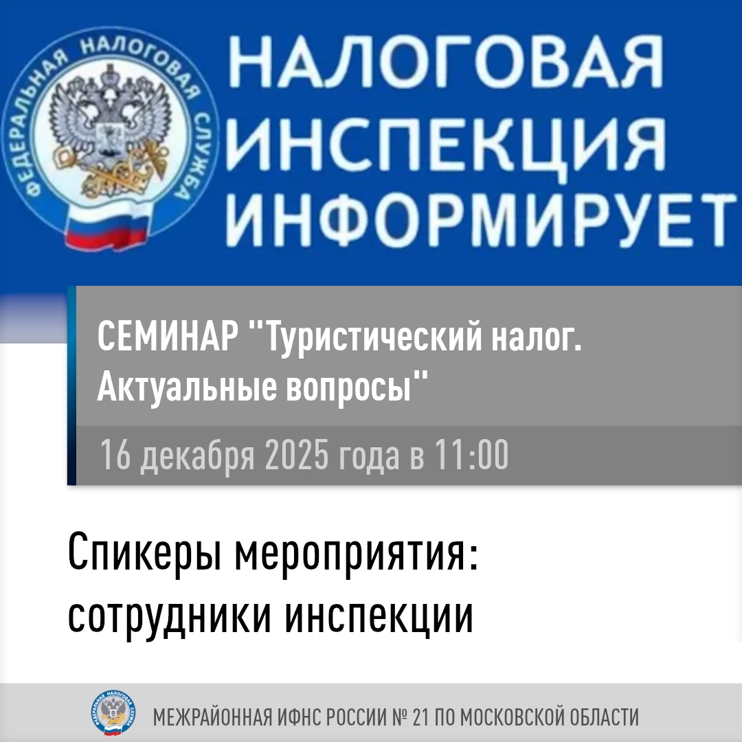 16 декабря в 11.00 Межрайонная инспекция Федеральной налоговой службы №21 по Московской области в актовом зале инспекции по адресу: г. Руза, ул. Революционная, 23 проведет бесплатный семинар «Туристический налог. Актуальные вопросы».