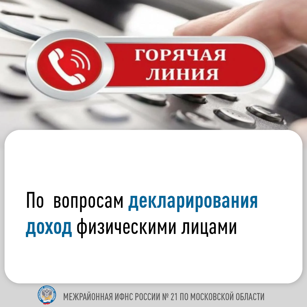 19 февраля с 9 до 17 часов Межрайонная ИФНС России № 21 по Московской области проведет «Горячую линию» по вопросам порядка подачи налоговой декларации о доходах физических лиц по форме 3-НДФЛ.