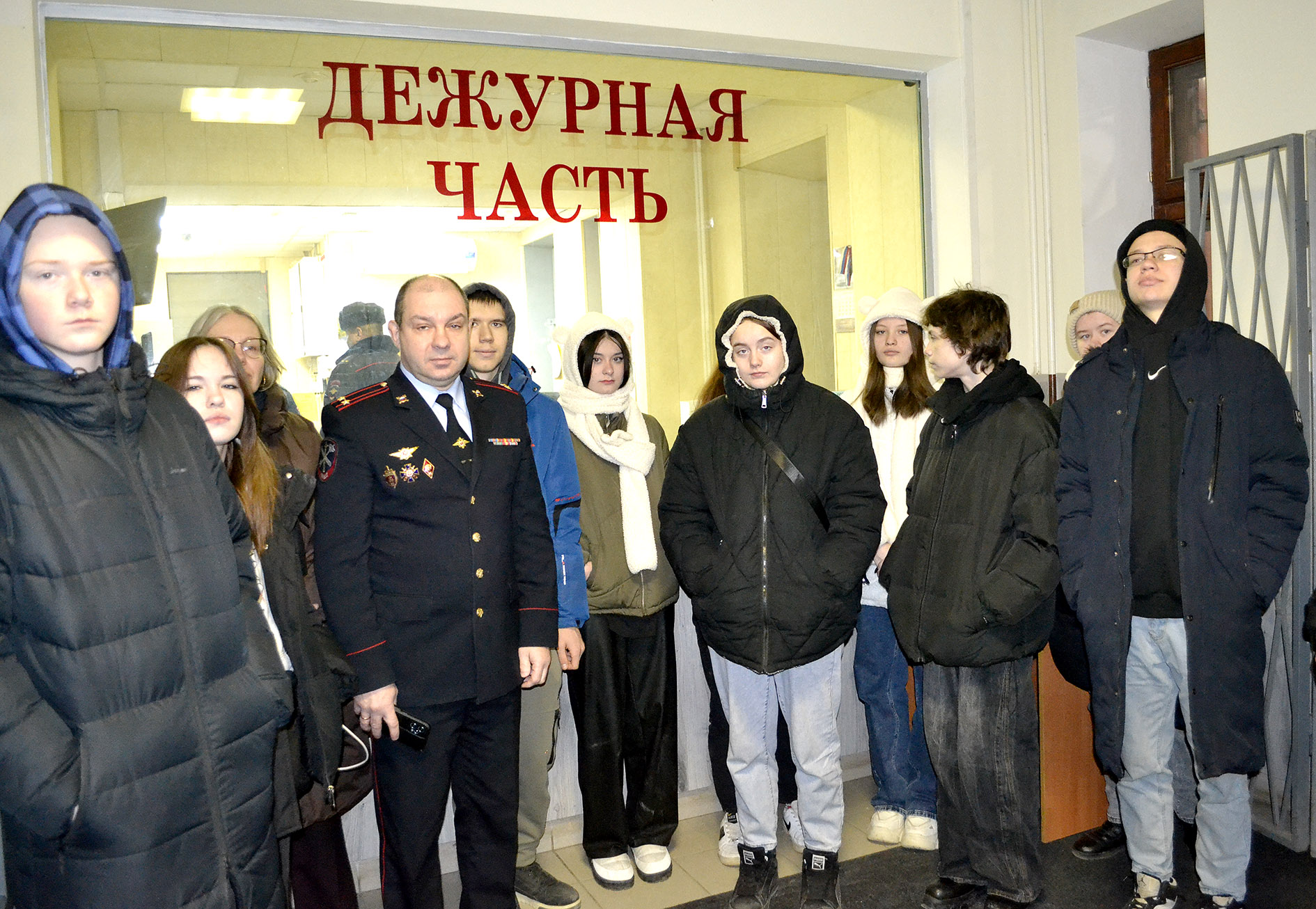 Юных посетителей встретил заместитель начальника ОМВД подполковник внутренней службы Максим Фомичёв. Первым делом он показал им дежурную часть, с которой начинается каждое отделение полиции. Ребята узнали, что оперативные дежурные находятся там круглосуточно. Они принимают все сообщения и заявления от граждан, организуют работу следственно-оперативных групп, отслеживают обстановку в городе при помощи мониторов камер видеонаблюдения.
