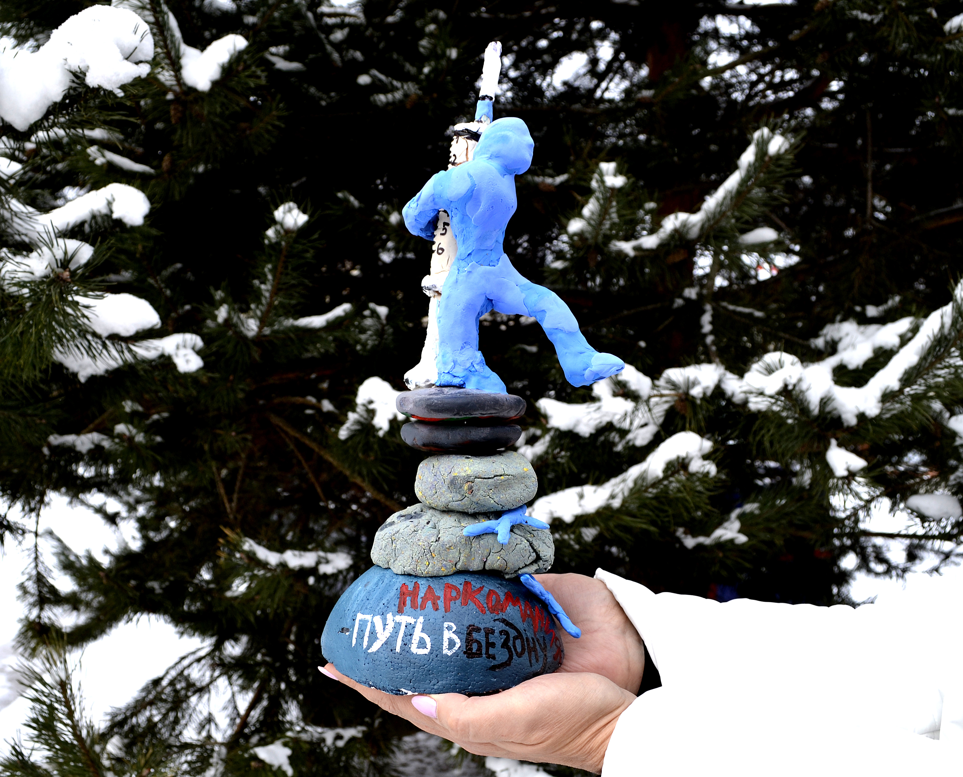 Двенадцатилетние Антон Сияков и Закария Абдульхаким под руководством педагога дополнительного образования Елены Мельниченко предоставили на конкурс инсталляцию под названием «Зависимость». Поделка из пенопласта, проволоки, пластика и воздушного пластилина представляет собой фигуру человека, находящегося на верхушке шаткой пирамиды из камней, цепляющегося за шприц и шагающего в бездну. Внизу виднеются безжизненные тела тех, кто уже стал жертвами наркомании.